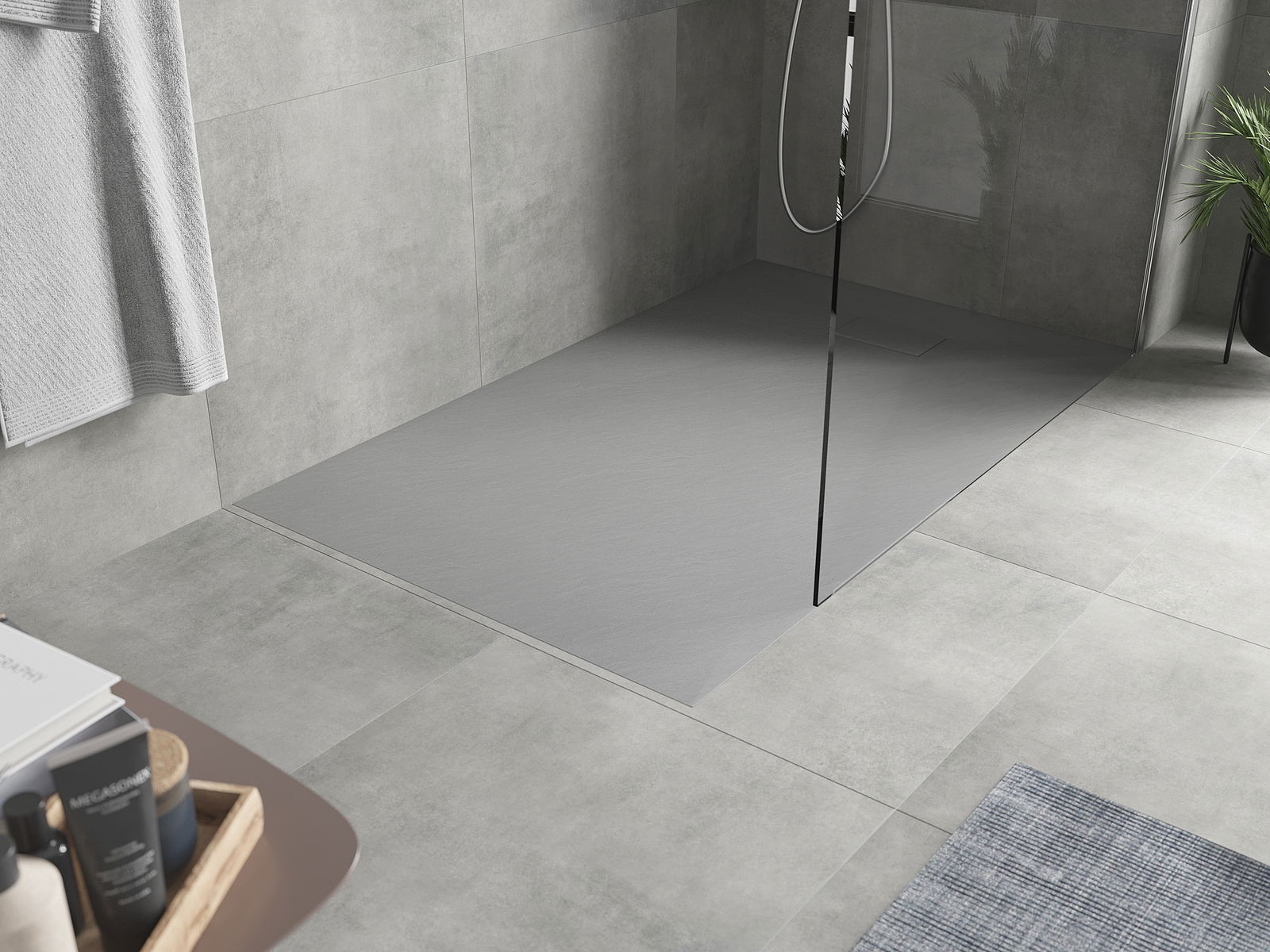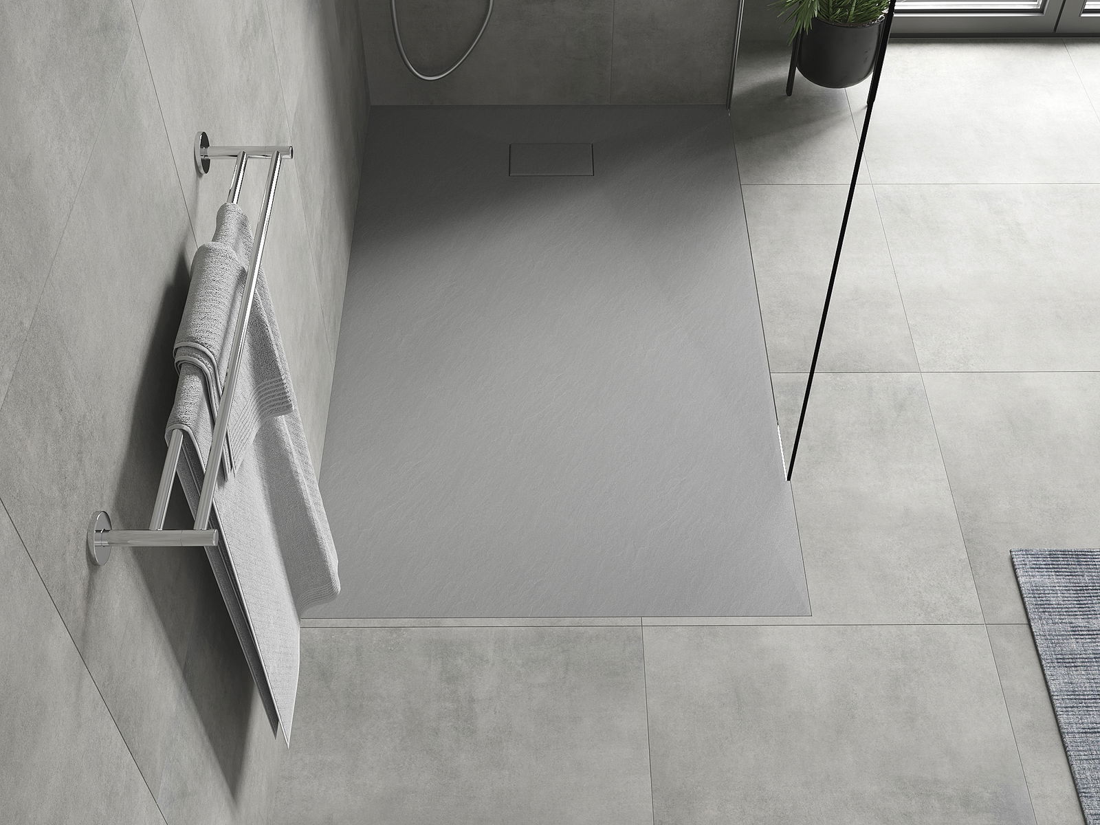 The surface of the shower tray resembles a stone with its structure. It is a unique combination of natural appearance with a modern interior arrangement. It adds character, emphasizes the aesthetics and elegance of the bathroom decor and impresses with its form.