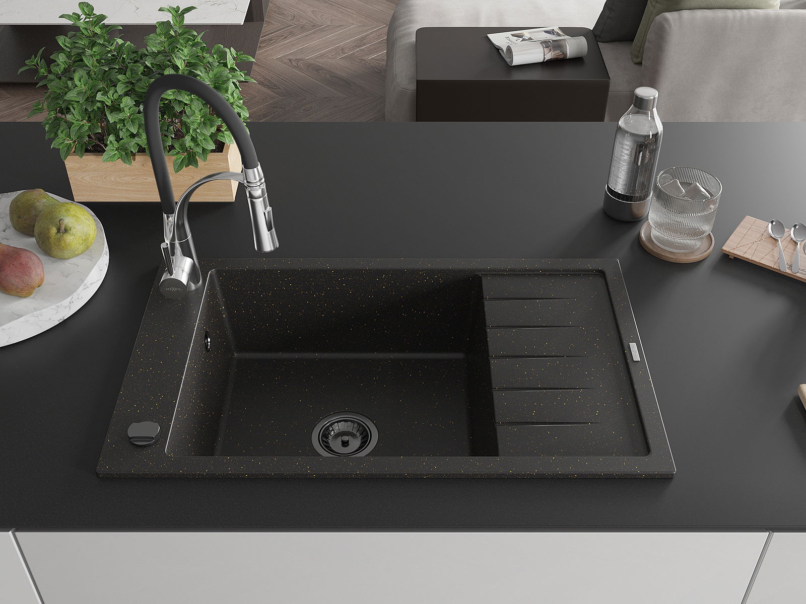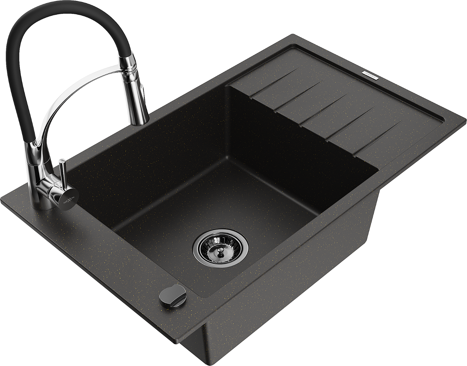 Mexen Elias granite sink single-bowl with drainer and Aster kitchen tap, black/gold metallic - 6511-75-73450-07-B
