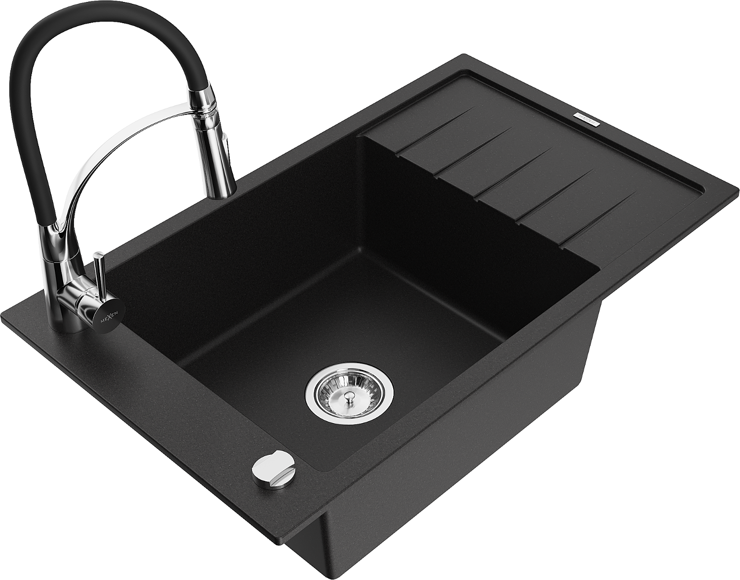 Mexen Elias granite sink 1-bowl with drainer and Aster kitchen tap, black - 6511-77-73450-07