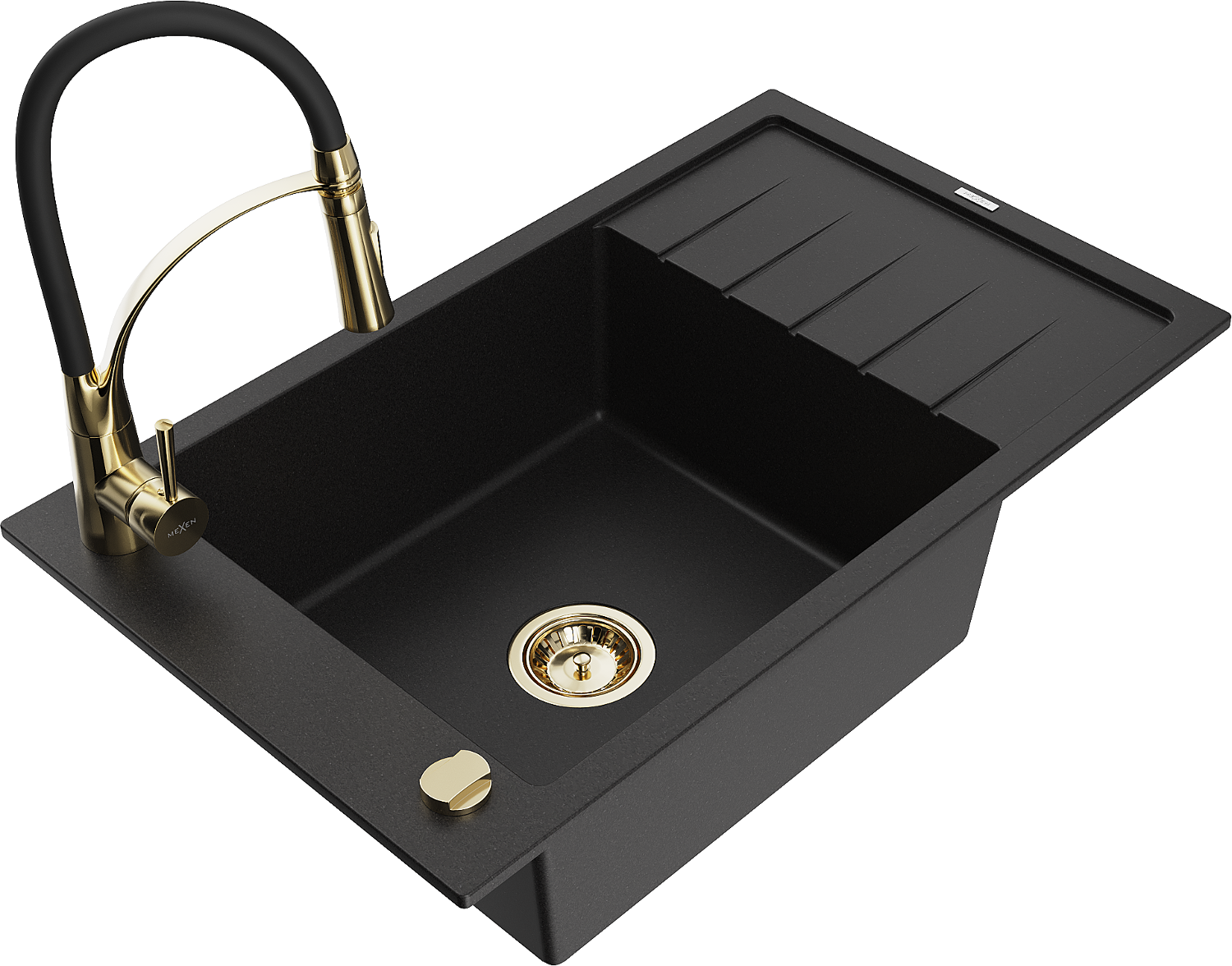 Mexen Elias granite kitchen sink 1-bowl with drainer and Aster kitchen tap, black - 6511-77-73450-57-G