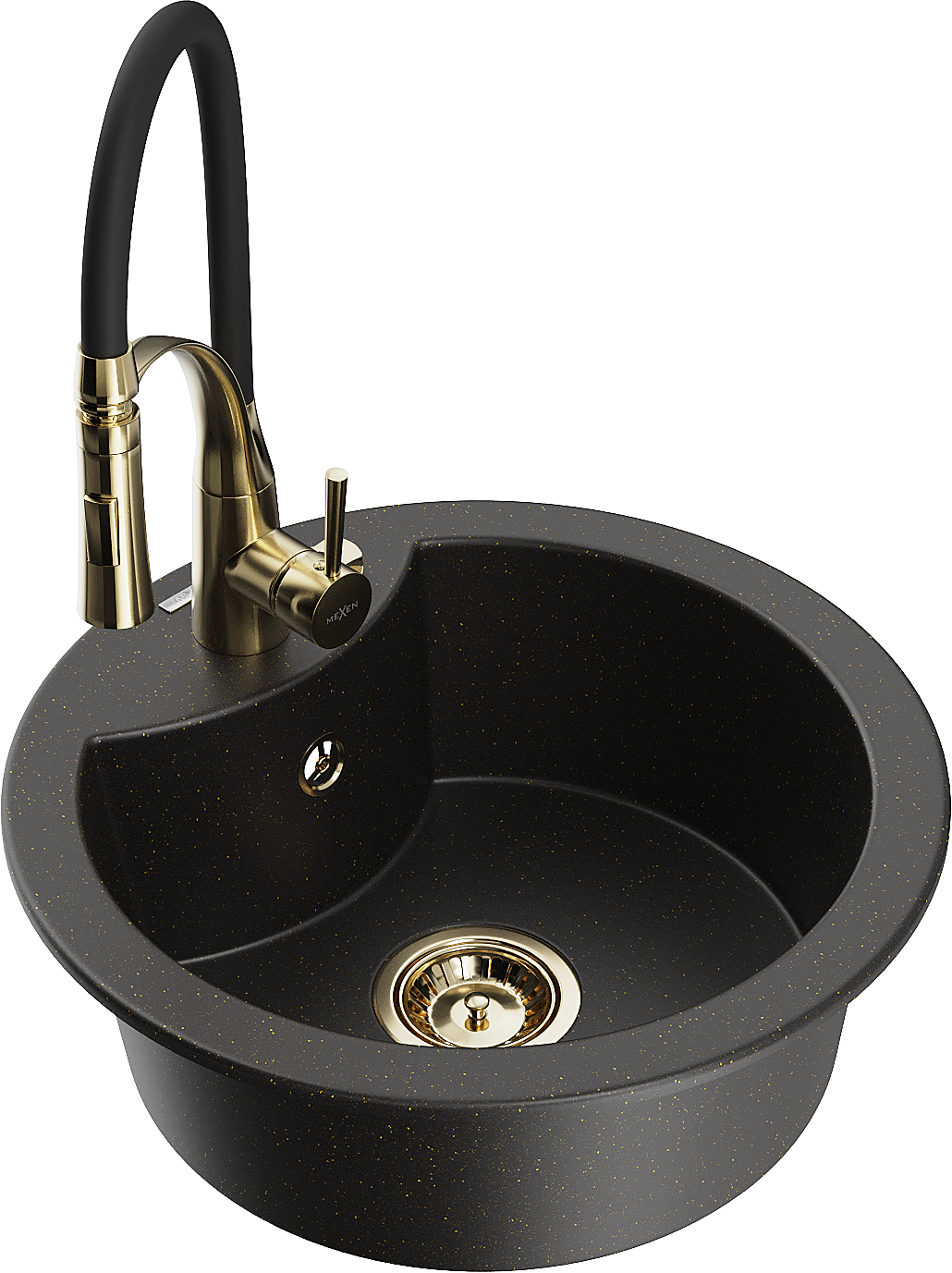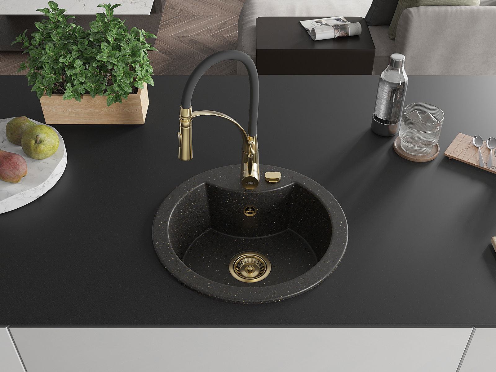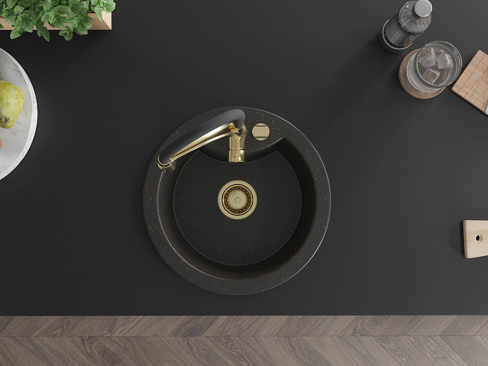 Mexen Diego granite kitchen sink 1-bowl with Aster kitchen tap, black/gold metallic - 6512-75-73450-57-G