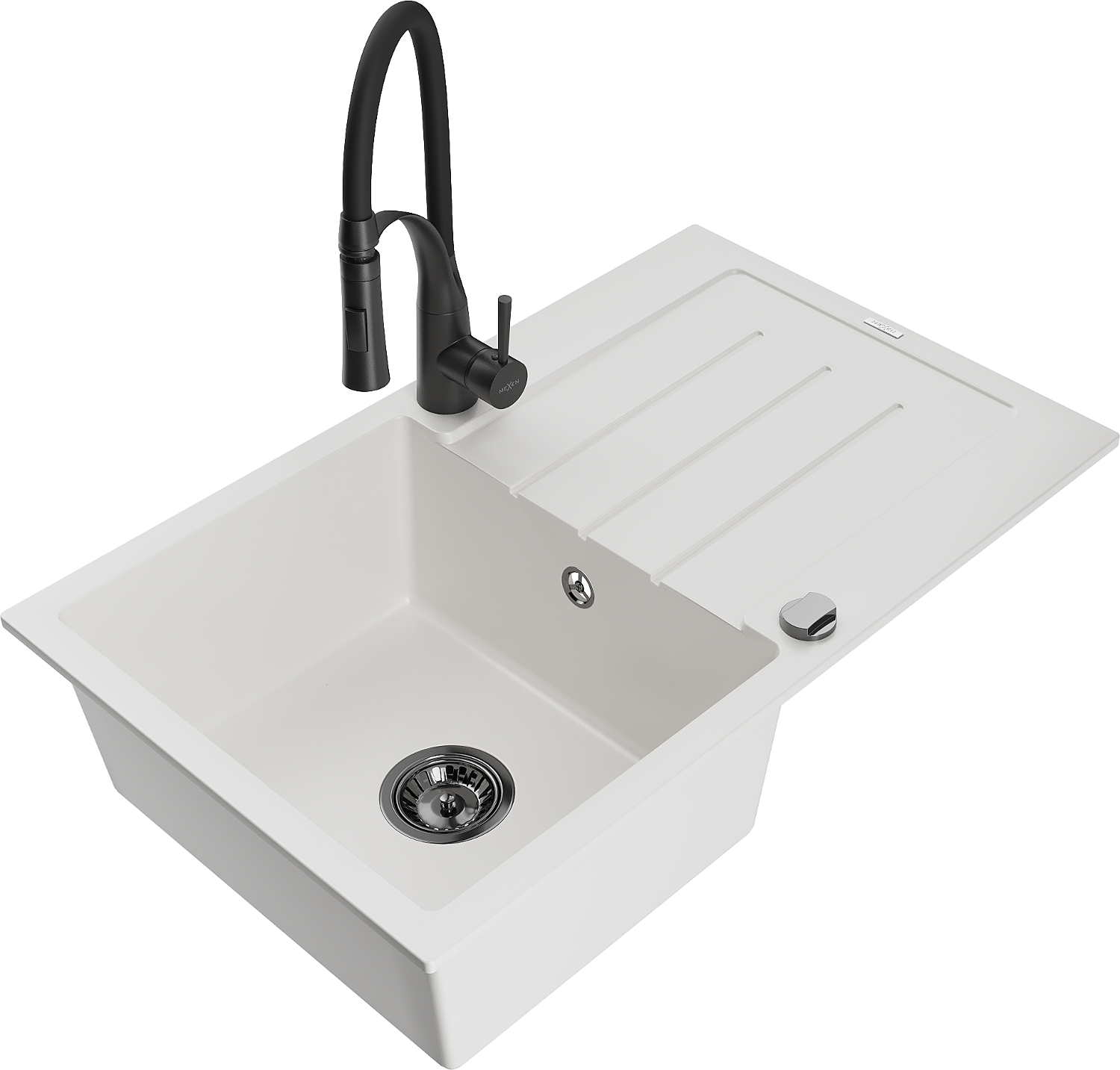 Mexen Bruno granite sink 1-bowl with drainer and Aster kitchen tap, white - 6513-20-73450-70-B