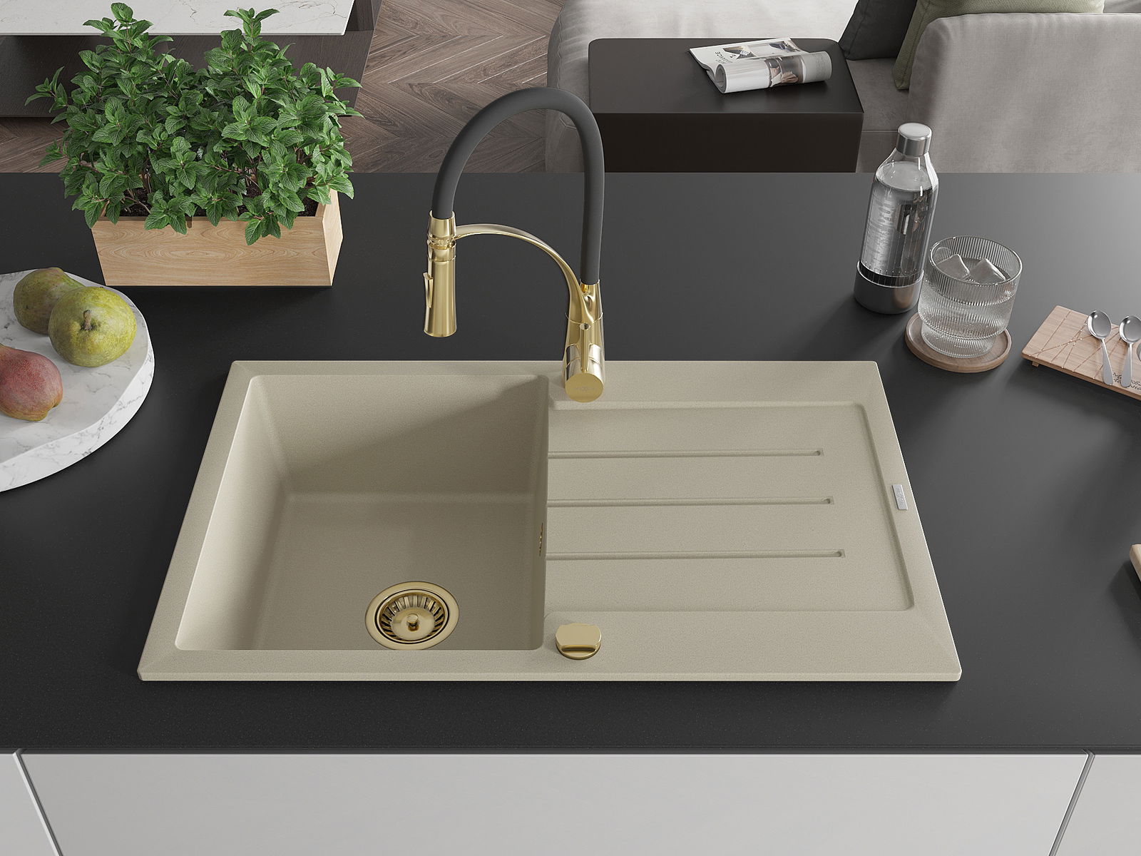 Mexen Bruno granite sink single-bowl with drainer and Aster kitchen tap, beige - 6513-69-73450-57-G