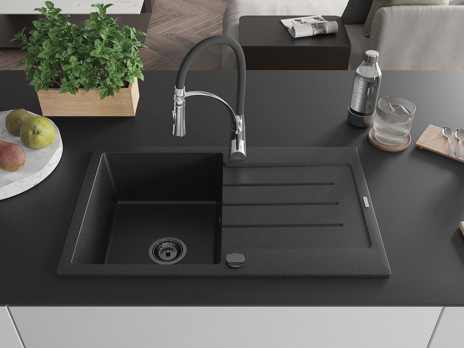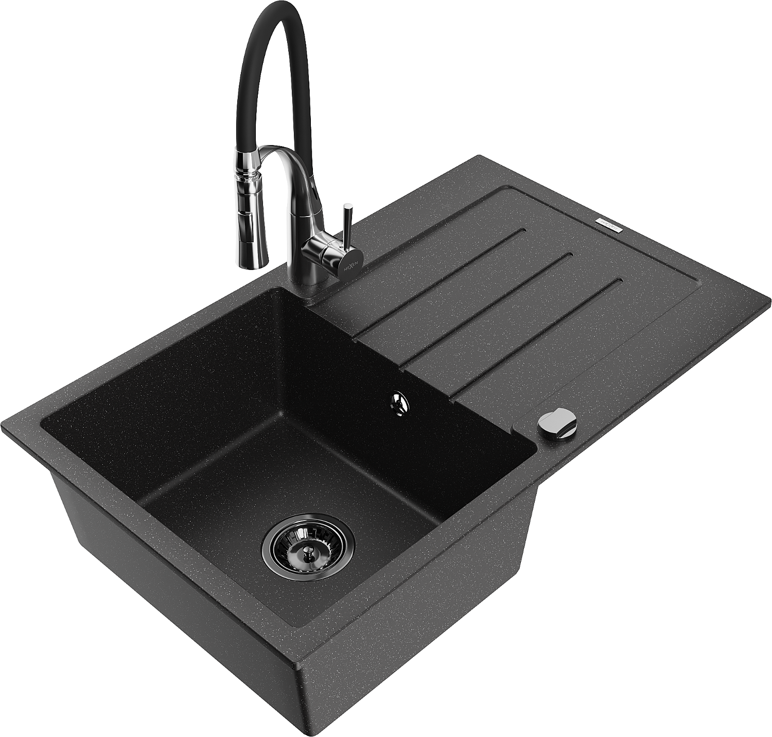 Mexen Bruno granite sink 1-bowl with drainer and Aster kitchen tap, black/silver metallic - 6513-73-73450-07-B