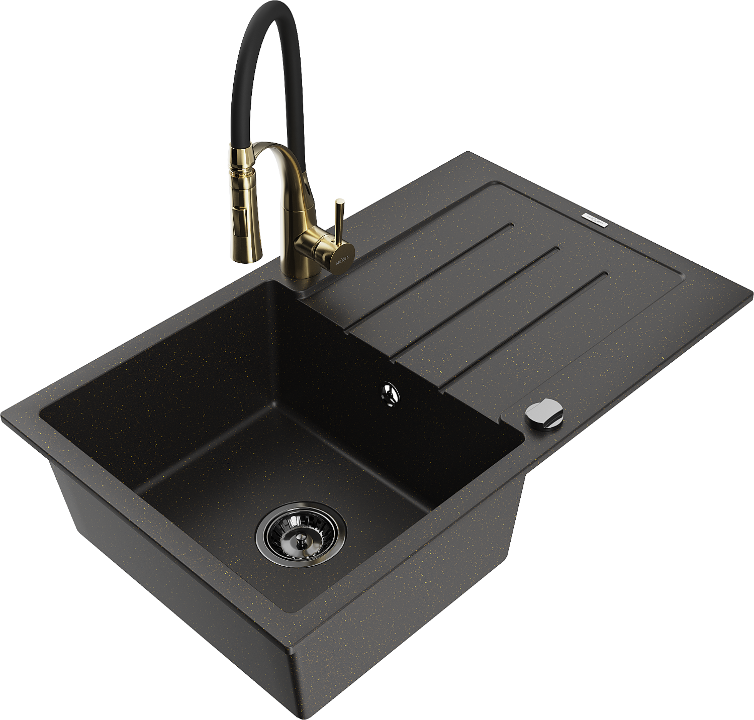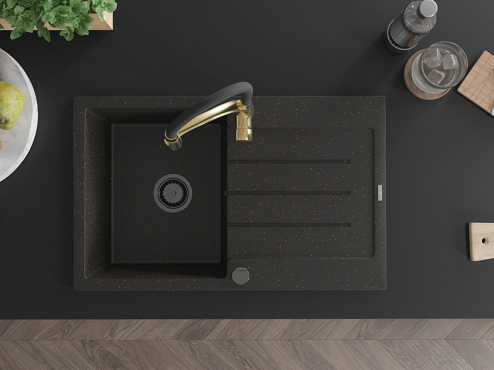 Mexen Bruno granite kitchen sink 1-bowl with drainer and Aster kitchen mixer, black/gold metallic - 6513-75-73450-57-B