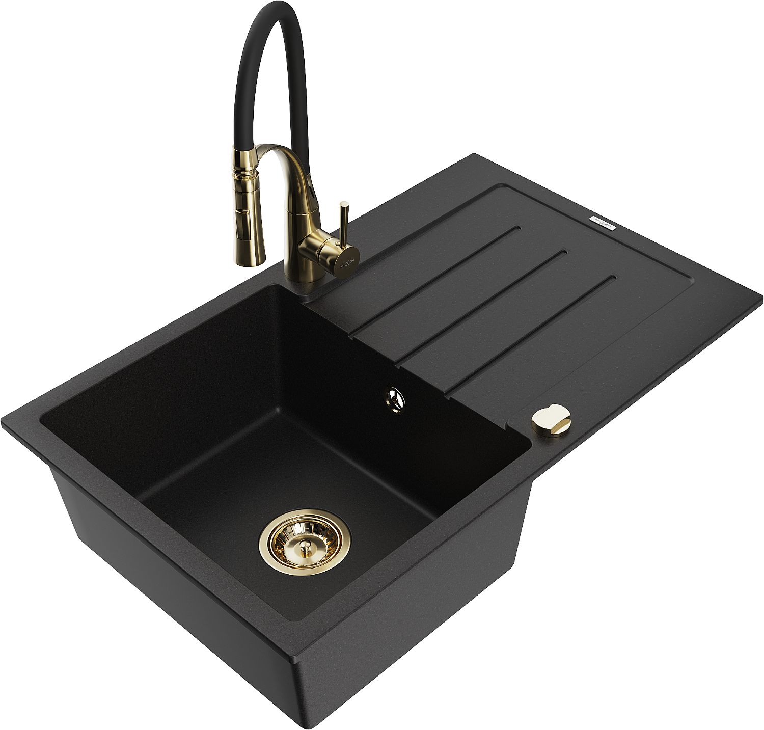 Mexen Bruno granite sink single-bowl with drainer and Aster kitchen tap, black - 6513-77-73450-57-G