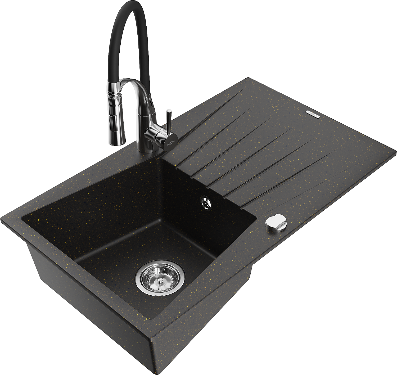 Mexen Cesar granite sink 1-bowl with drainer and Aster kitchen tap, black/gold metallic - 6514-75-73450-07