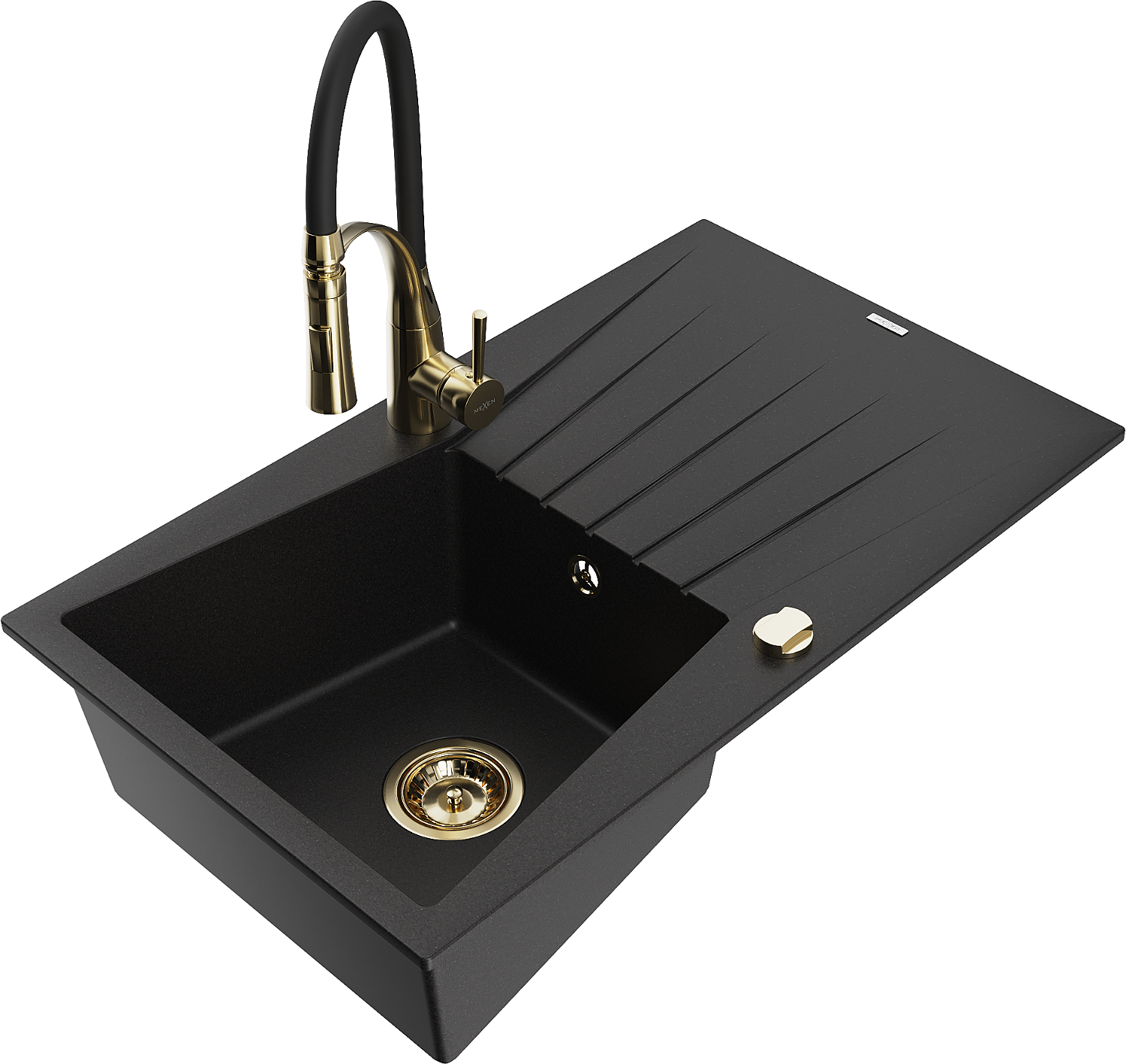 Mexen Cesar granite sink with 1 basin, drainer and Aster kitchen tap, black - 6514-77-73450-57-G