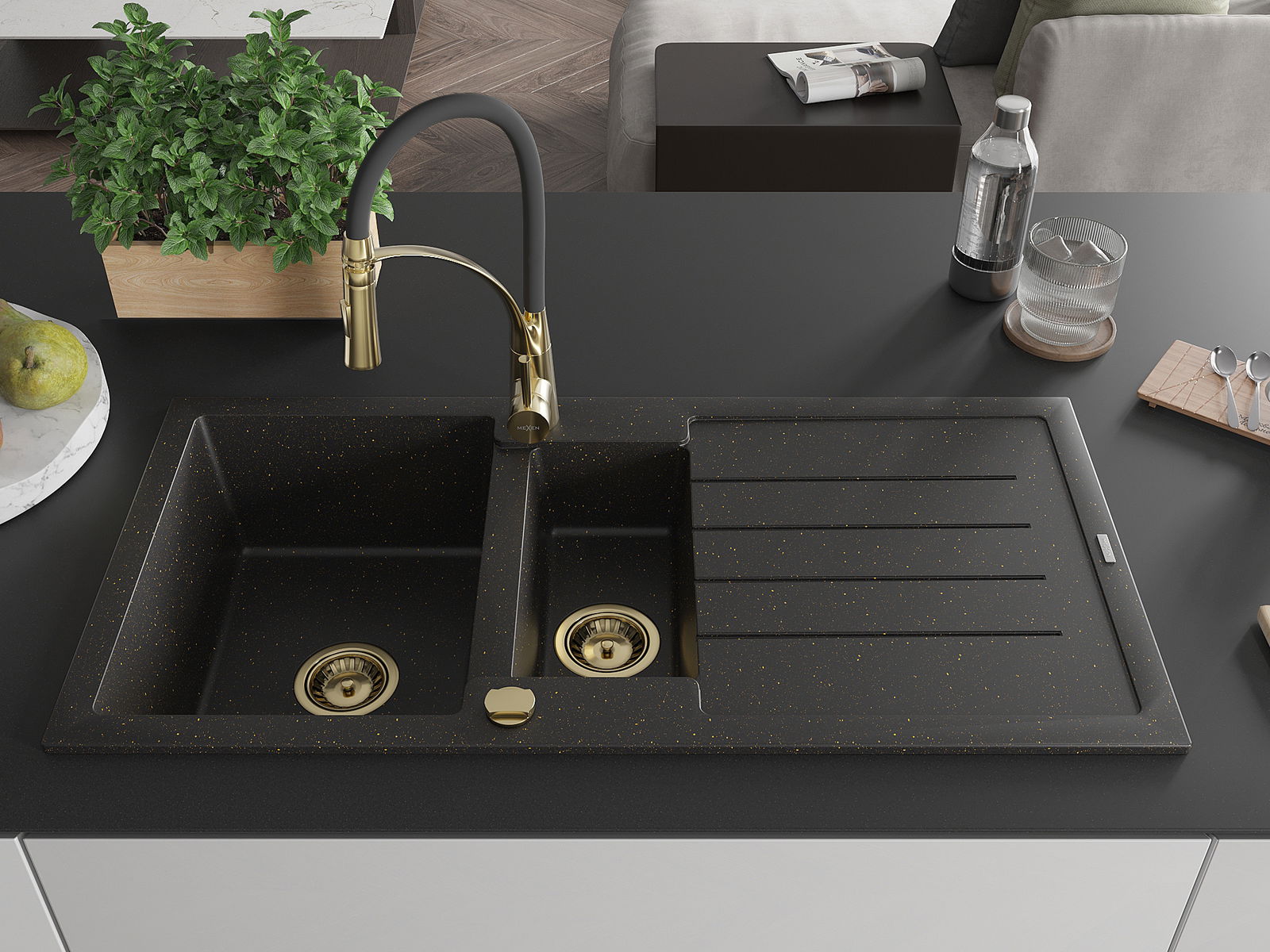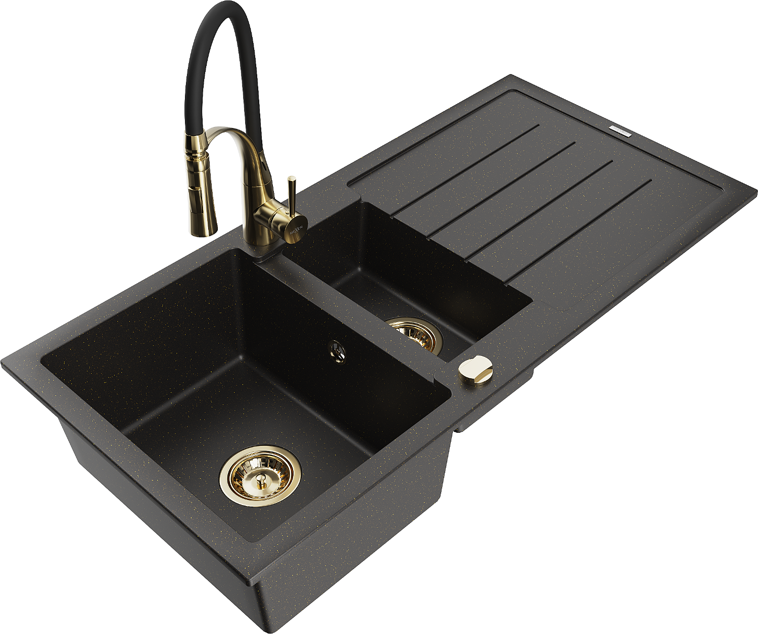 Mexen Andres granite sink 1.5-bowl with drainer and kitchen tap Aster, black/gold metallic - 6515-75-73450-57-G