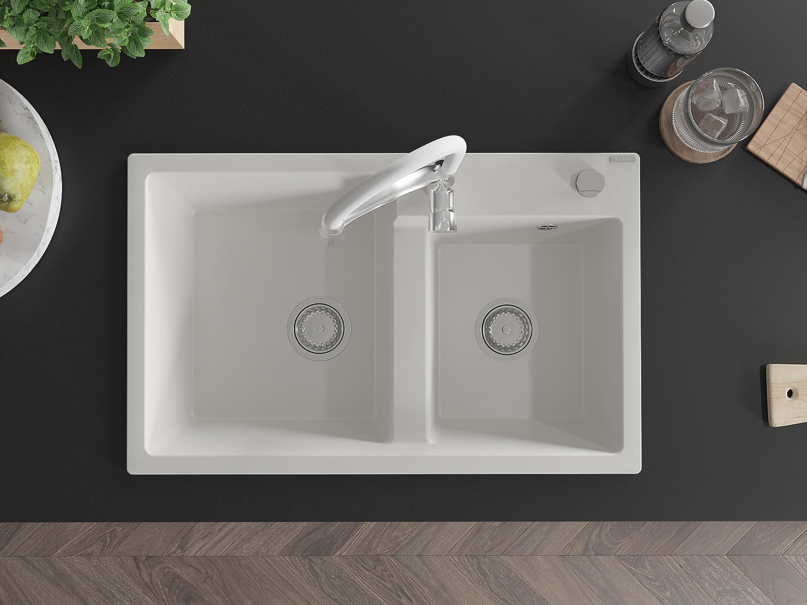 Mexen Tomas granite sink 2-chamber with Aster kitchen tap, white - 6516-20-73450-02