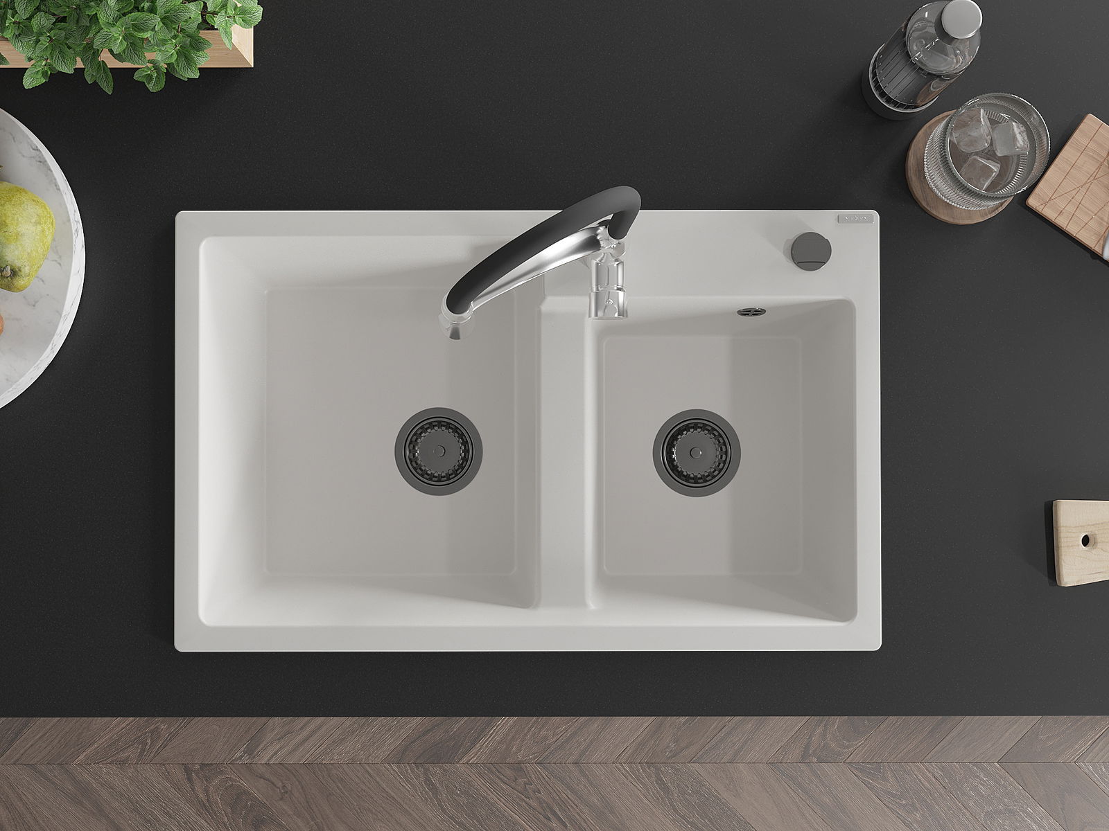 Mexen Tomas Granite 2-Bowl Sink with Aster Kitchen Tap, White - 6516-20-73450-07-B