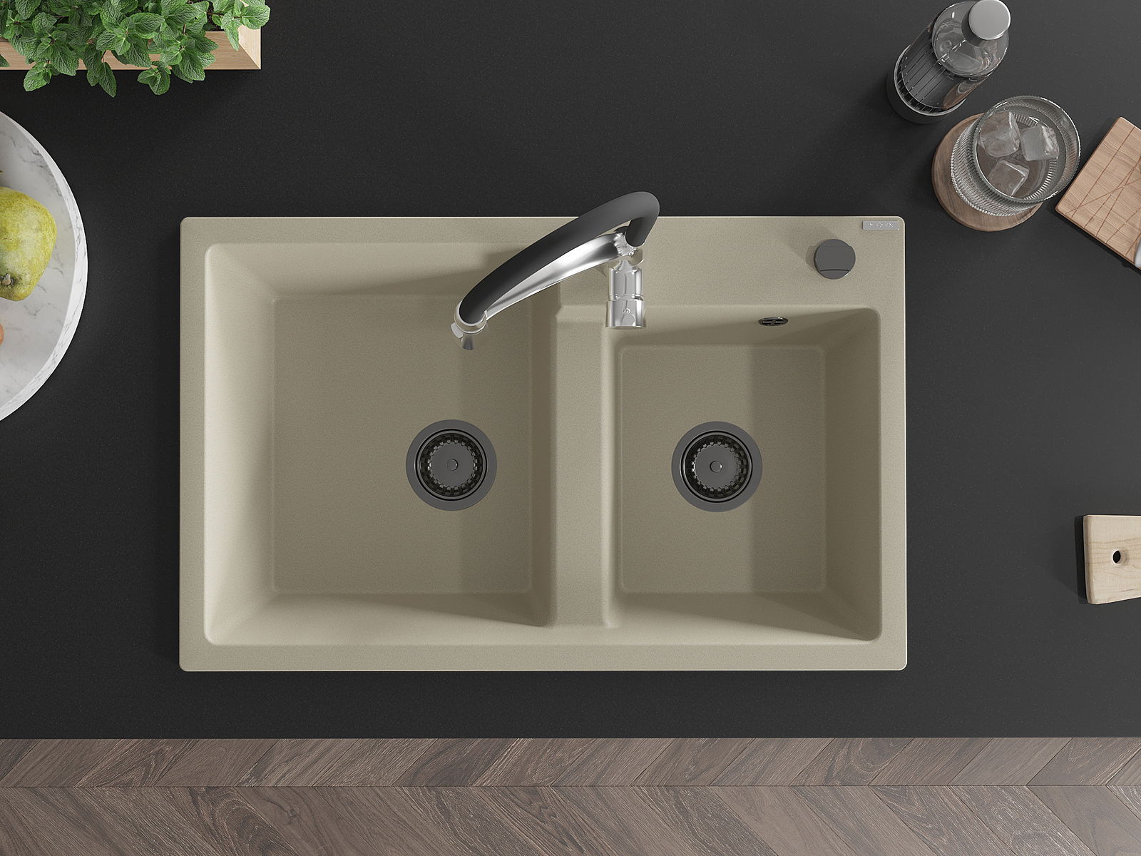 Mexen Tomas granite sink 2-bowl with Aster kitchen tap, beige - 6516-69-73450-07-B