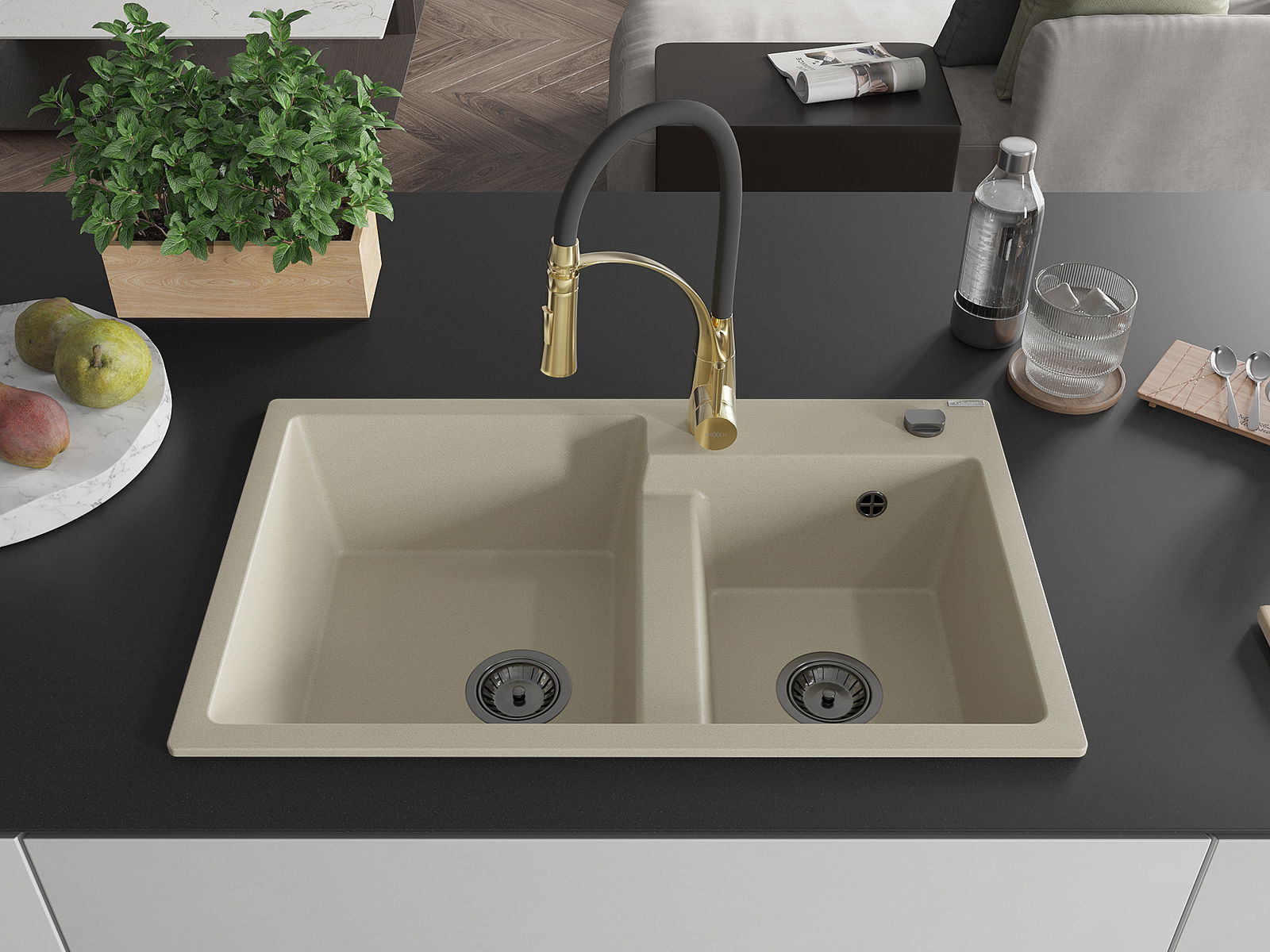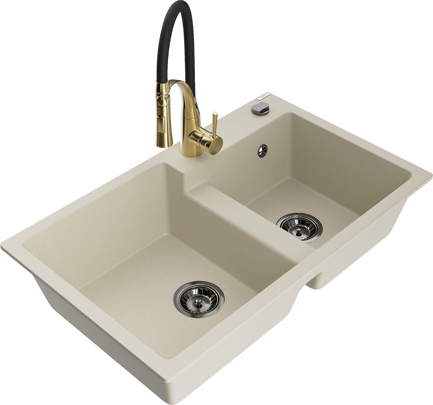 Mexen Tomas granite sink 2-chamber with Aster kitchen tap, beige - 6516-69-73450-57-B