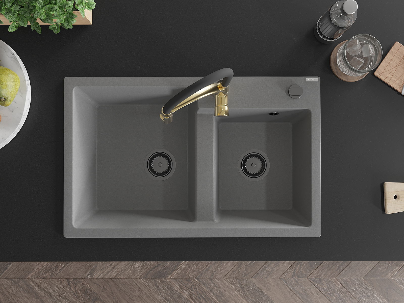 Mexen Tomas granite sink with 2 compartments and Aster kitchen tap, grey - 6516-71-73450-57-B