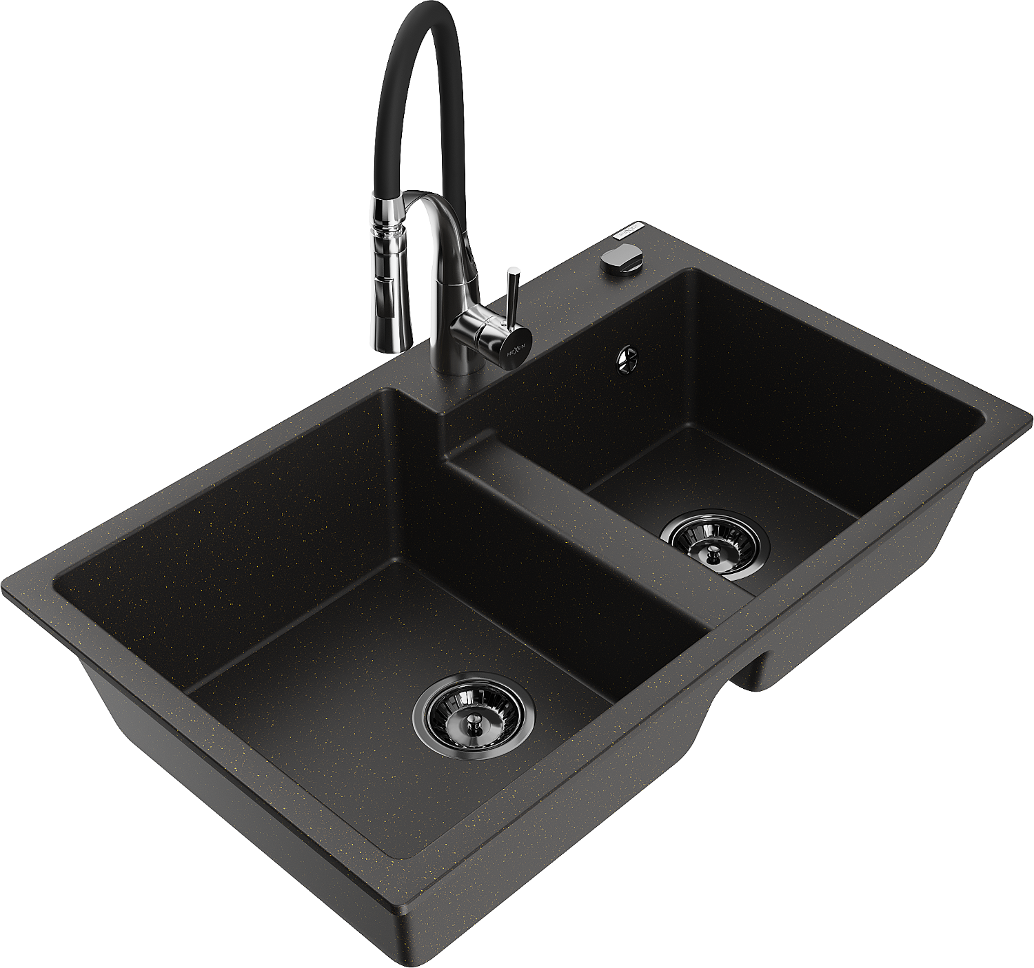 Mexen Tomas 2-bowl granite kitchen sink with Aster tap, black/gold metallic - 6516-75-73450-07-B