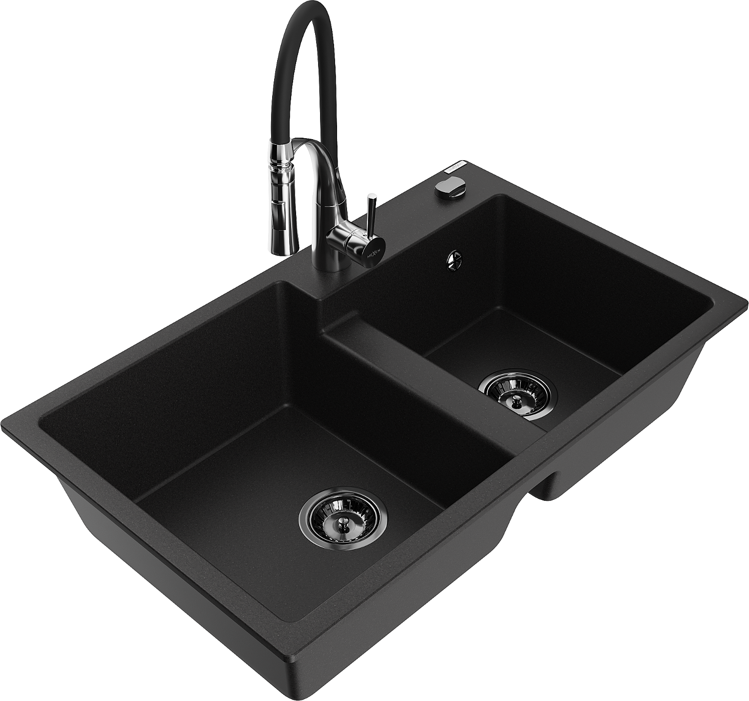 Mexen Tomas granite sink 2-bowl with Aster kitchen tap, black - 6516-77-73450-07-B