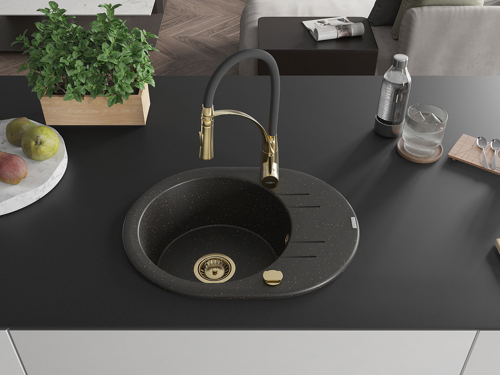 Mexen Kevin single-bowl granite sink with drainer and Aster kitchen tap, black/gold metallic - 6517-75-73450-57-G