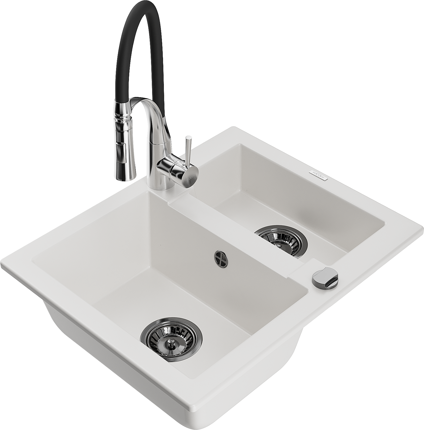Mexen Carlos granite sink 1.5-bowl with Aster kitchen tap, white - 6518-20-73450-07-B
