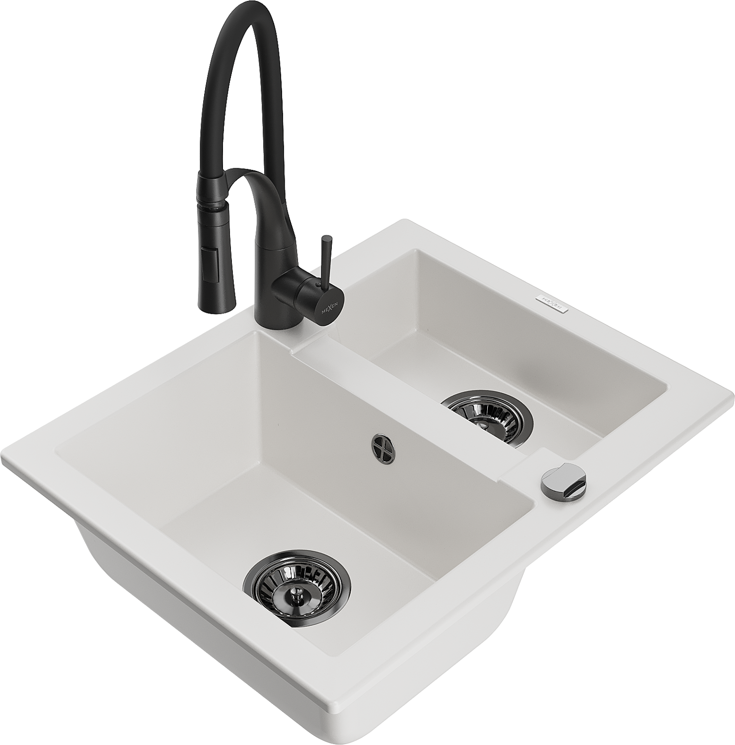 Mexen Carlos granite sink 1.5-bowl with Aster kitchen tap, white - 6518-20-73450-70-B