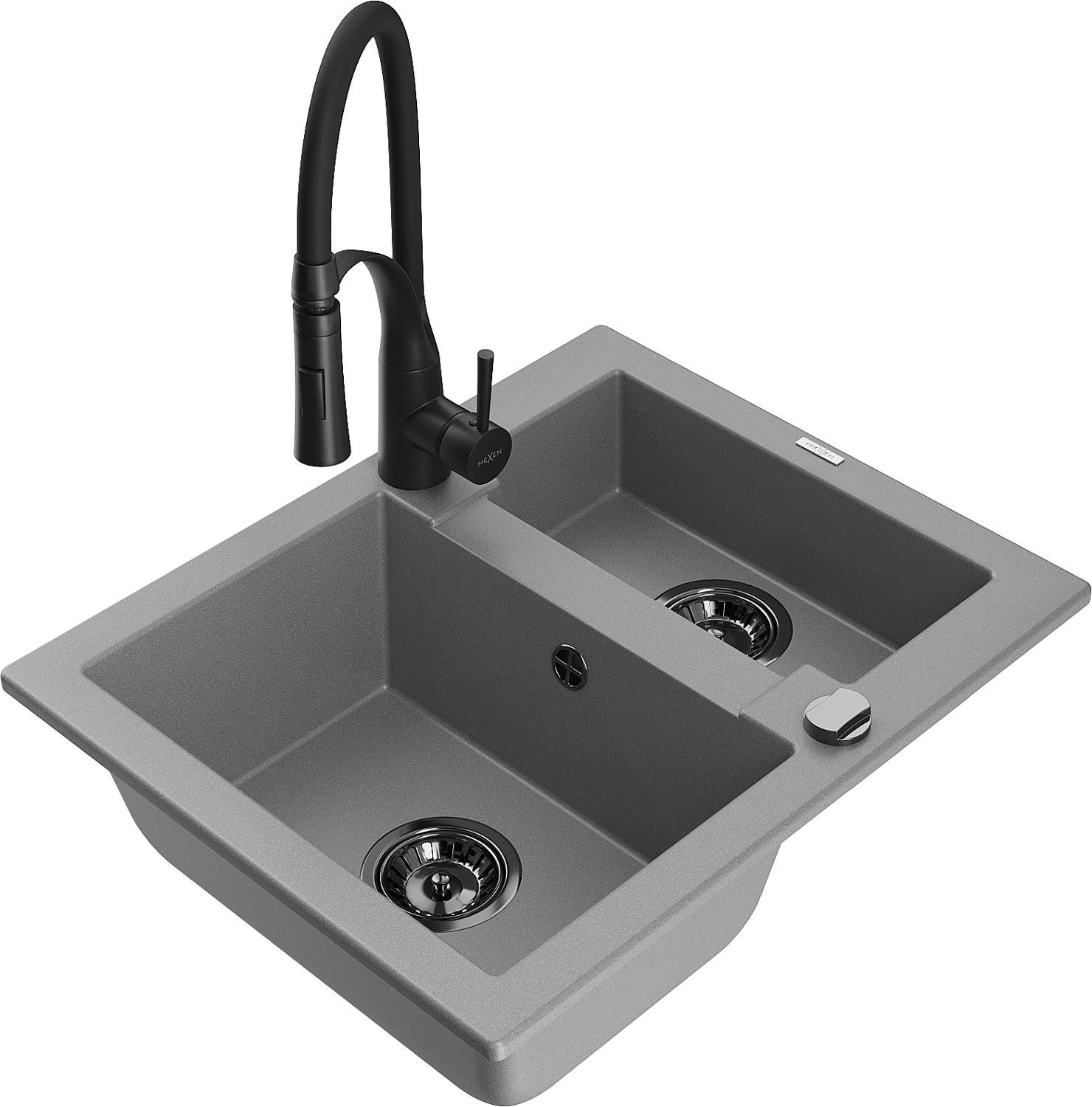 Mexen Carlos granite sink 1.5-bowl with Aster kitchen tap, grey - 6518-71-73450-70-B