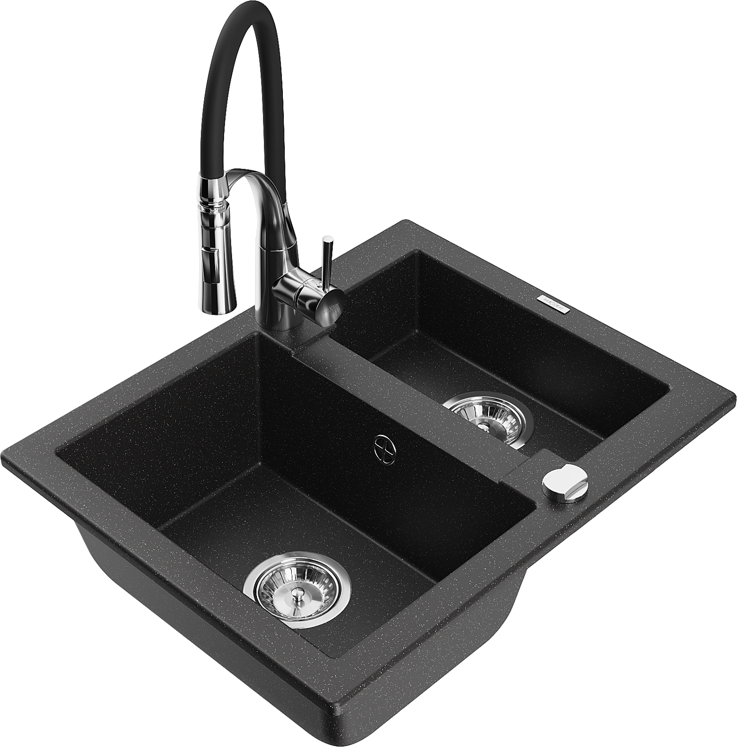 Mexen Carlos 1.5-bowl granite sink with Aster kitchen tap, black/silver metallic - 6518-73-73450-07