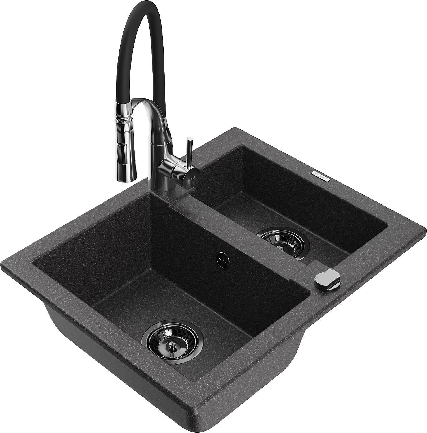Mexen Carlos 1.5-bowl granite sink with Aster kitchen tap, speckled black - 6518-76-73450-07-B