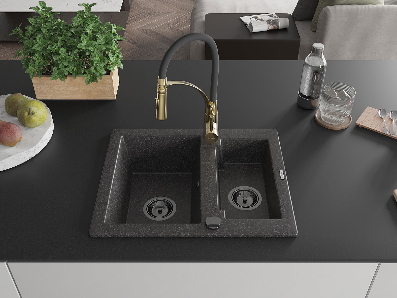 Mexen Carlos 1.5-bowl granite sink with Aster kitchen tap, black speckled - 6518-76-73450-57-B