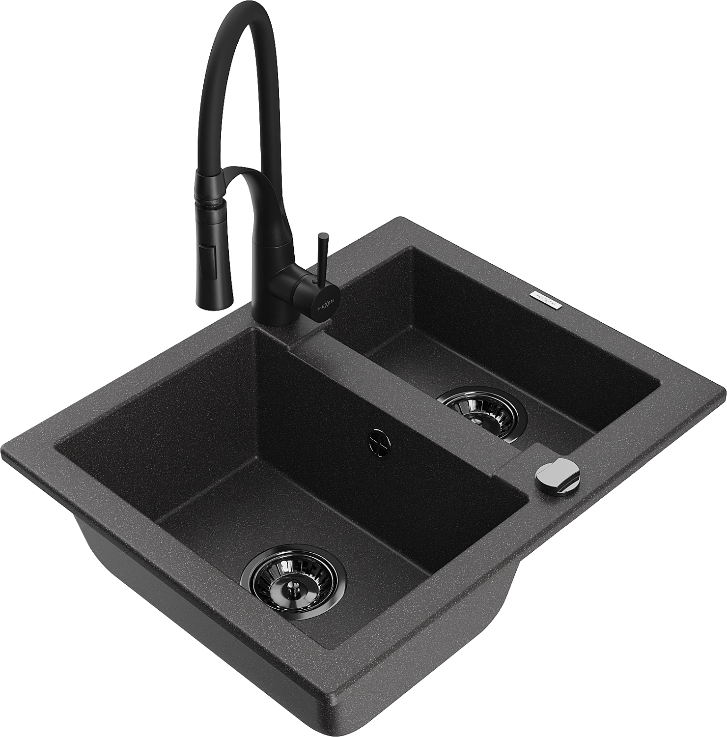 Mexen Carlos granite kitchen sink 1.5-bowl with Aster kitchen tap, black speckled - 6518-76-73450-70-B