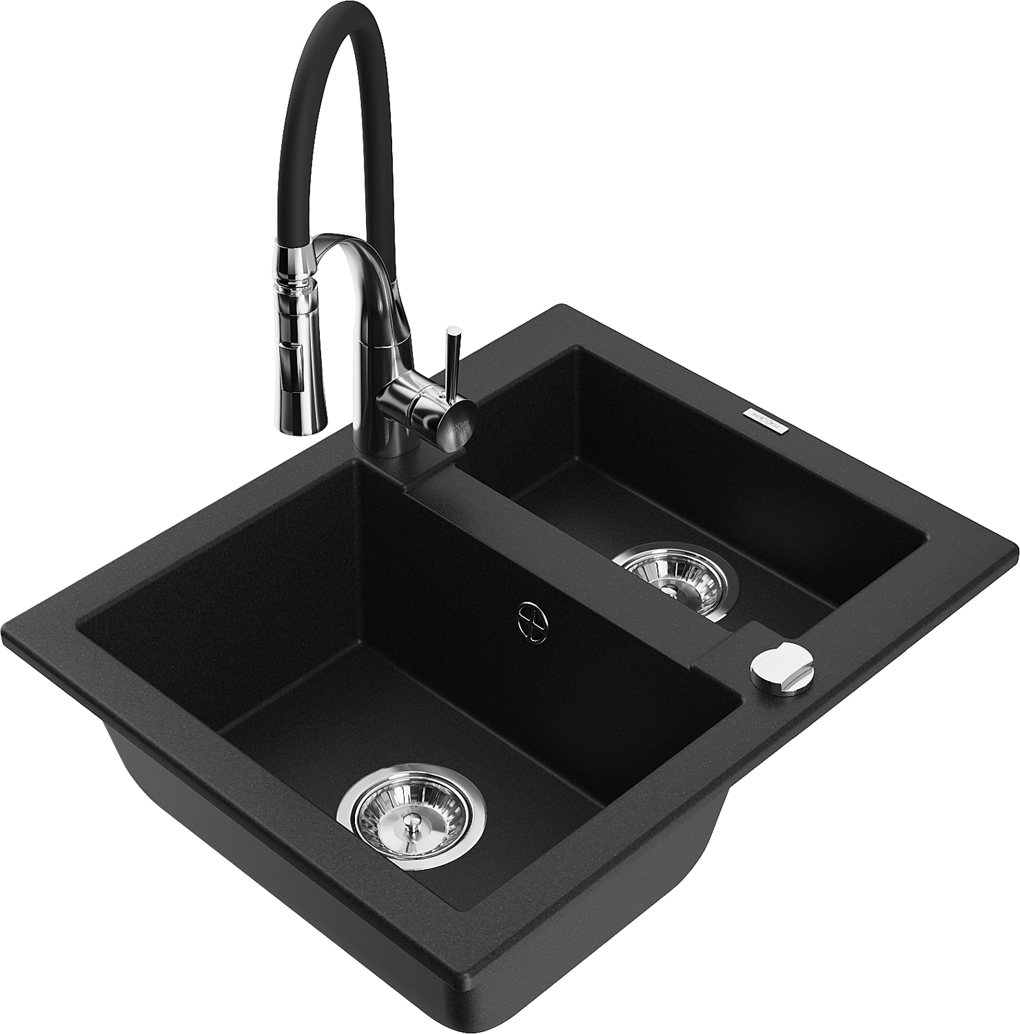 Mexen Carlos granite sink 1.5-bowl with Aster kitchen tap, black - 6518-77-73450-07