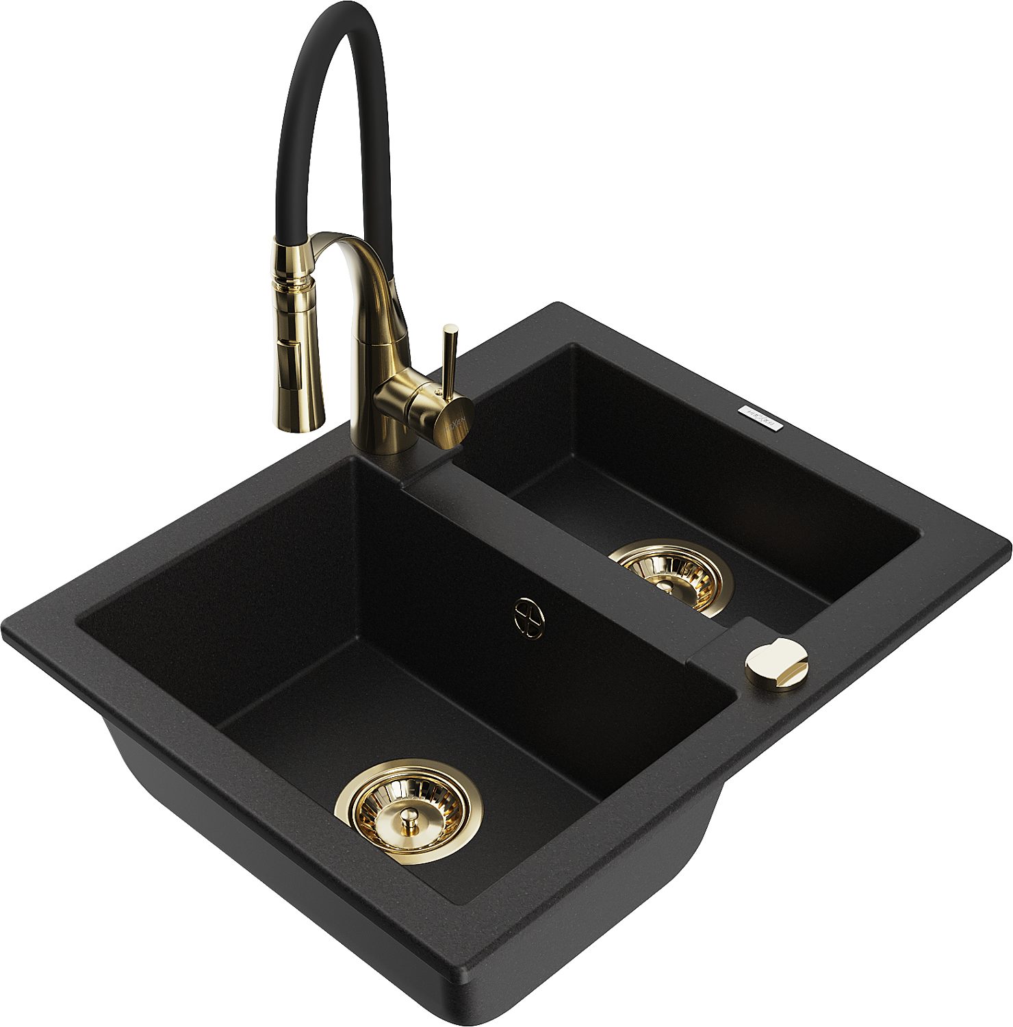 Mexen Carlos granite sink 1.5-bowl with Aster kitchen tap, black - 6518-77-73450-57-G