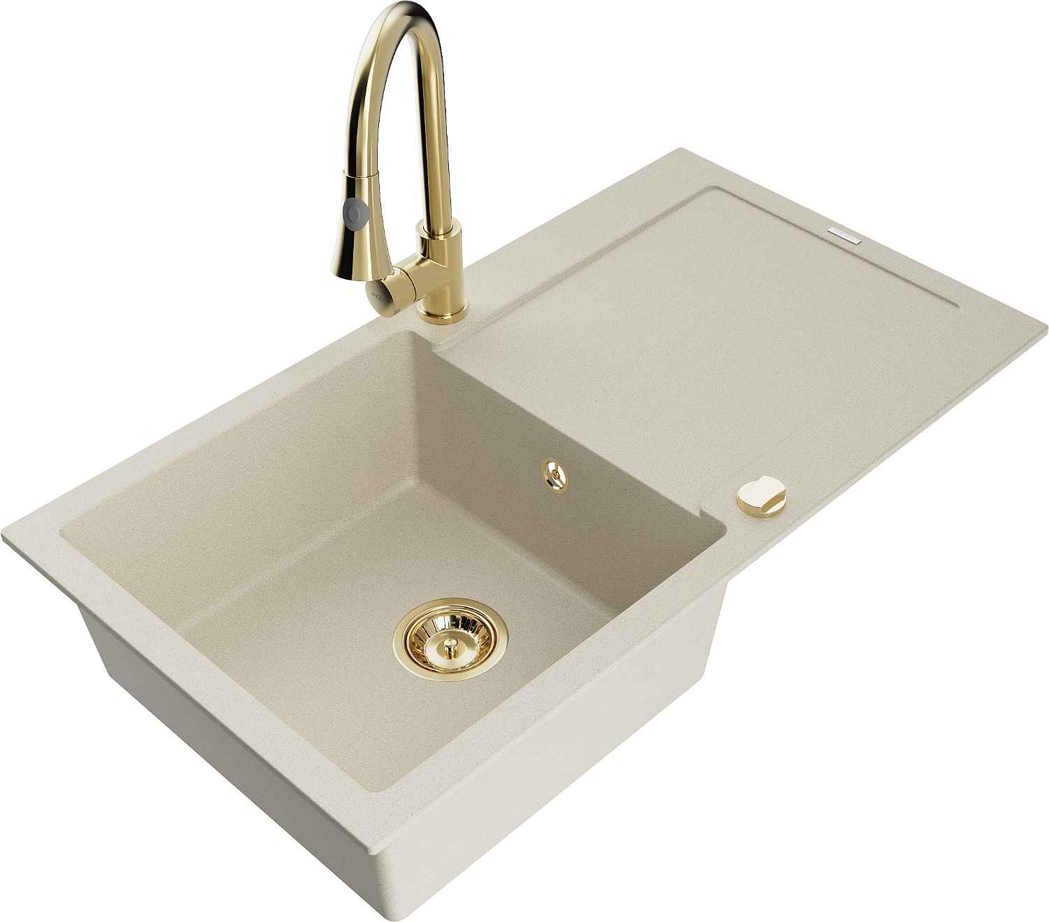Mexen Leo granite sink with 1 bowl, drainer, and Elia kitchen tap, beige - 6501-69-670101-50