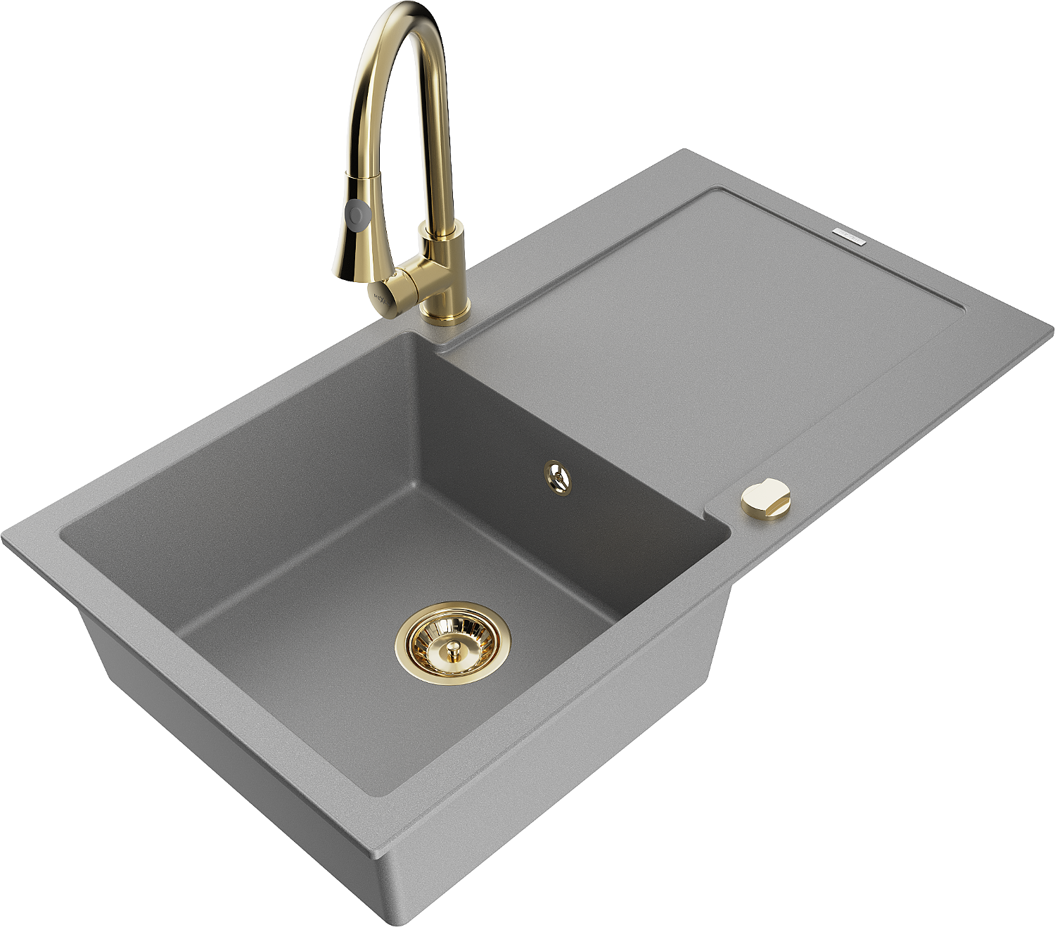 Mexen Leo granite sink 1-bowl with drainer and Elia kitchen tap, grey - 6501-71-670101-50