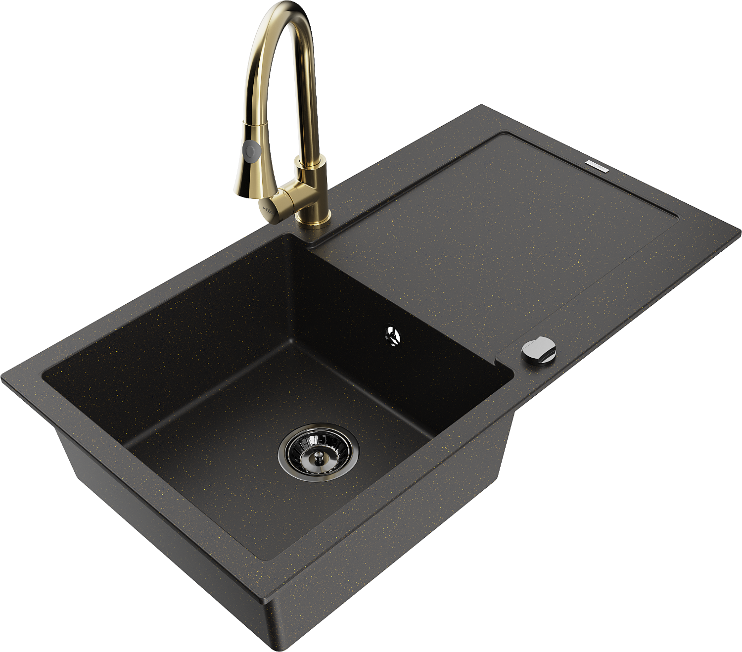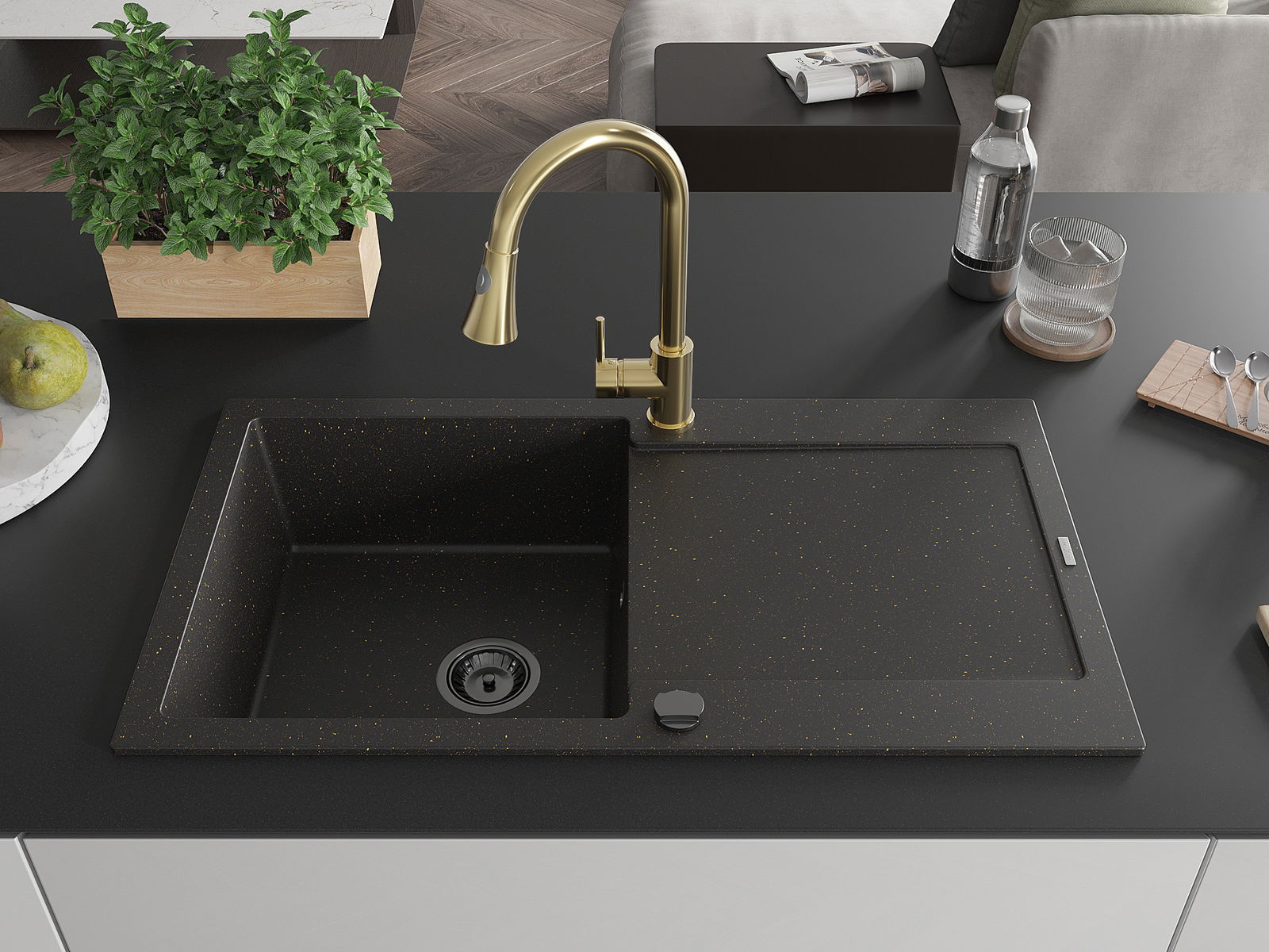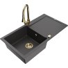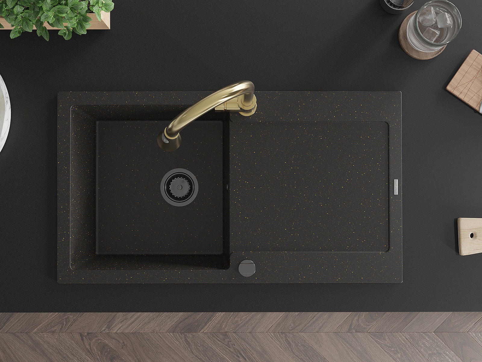 Mexen Leo granite sink with 1-bowl drainer and Elia kitchen tap, black/gold metallic - 6501-75-670101-50-B