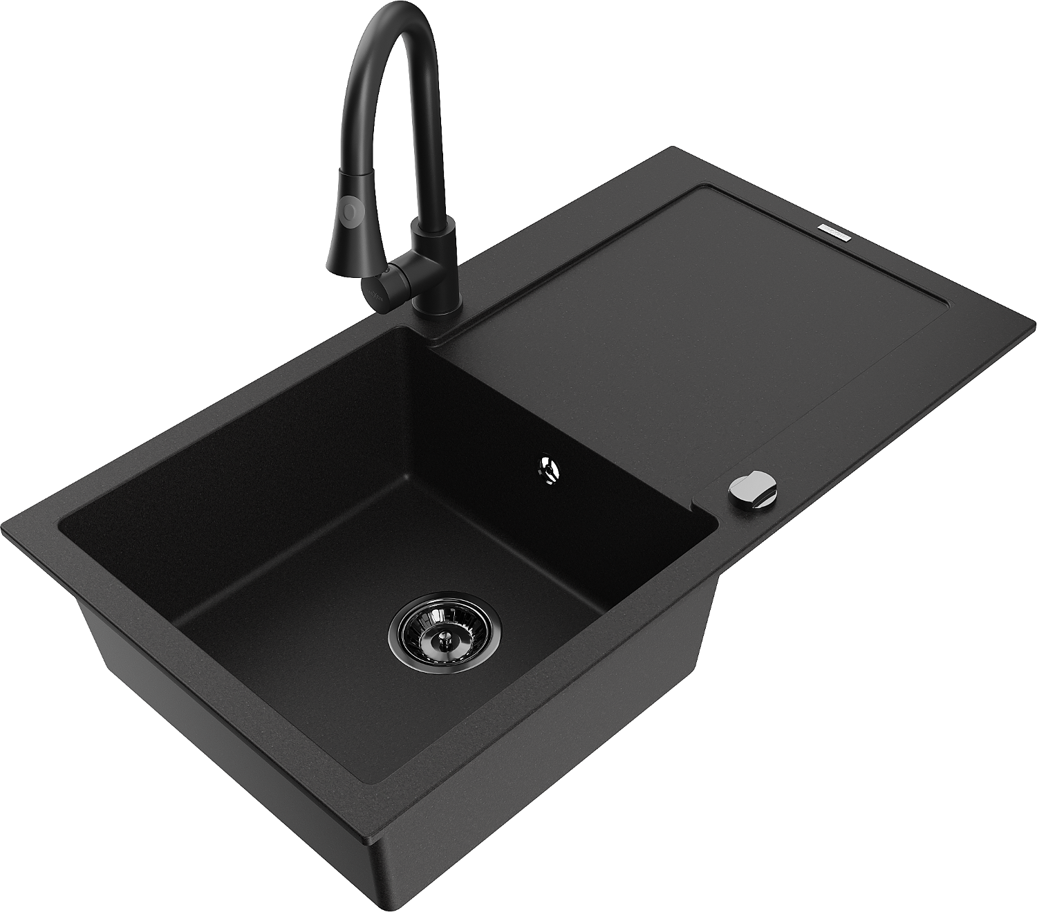 Mexen Leo 1-bowl granite sink with drainer and Elia kitchen tap, black - 6501-77-670101-70-B