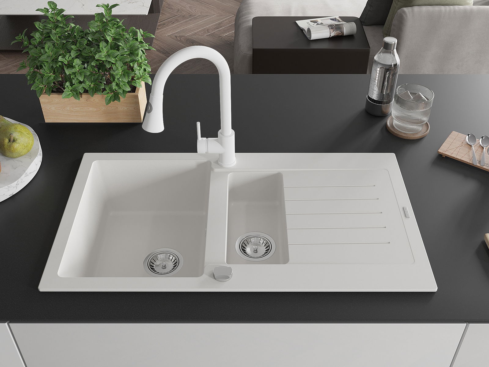 Mexen Matias granite sink 1.5-bowl with drainer and Elia kitchen tap, white - 6502-20-670101-20