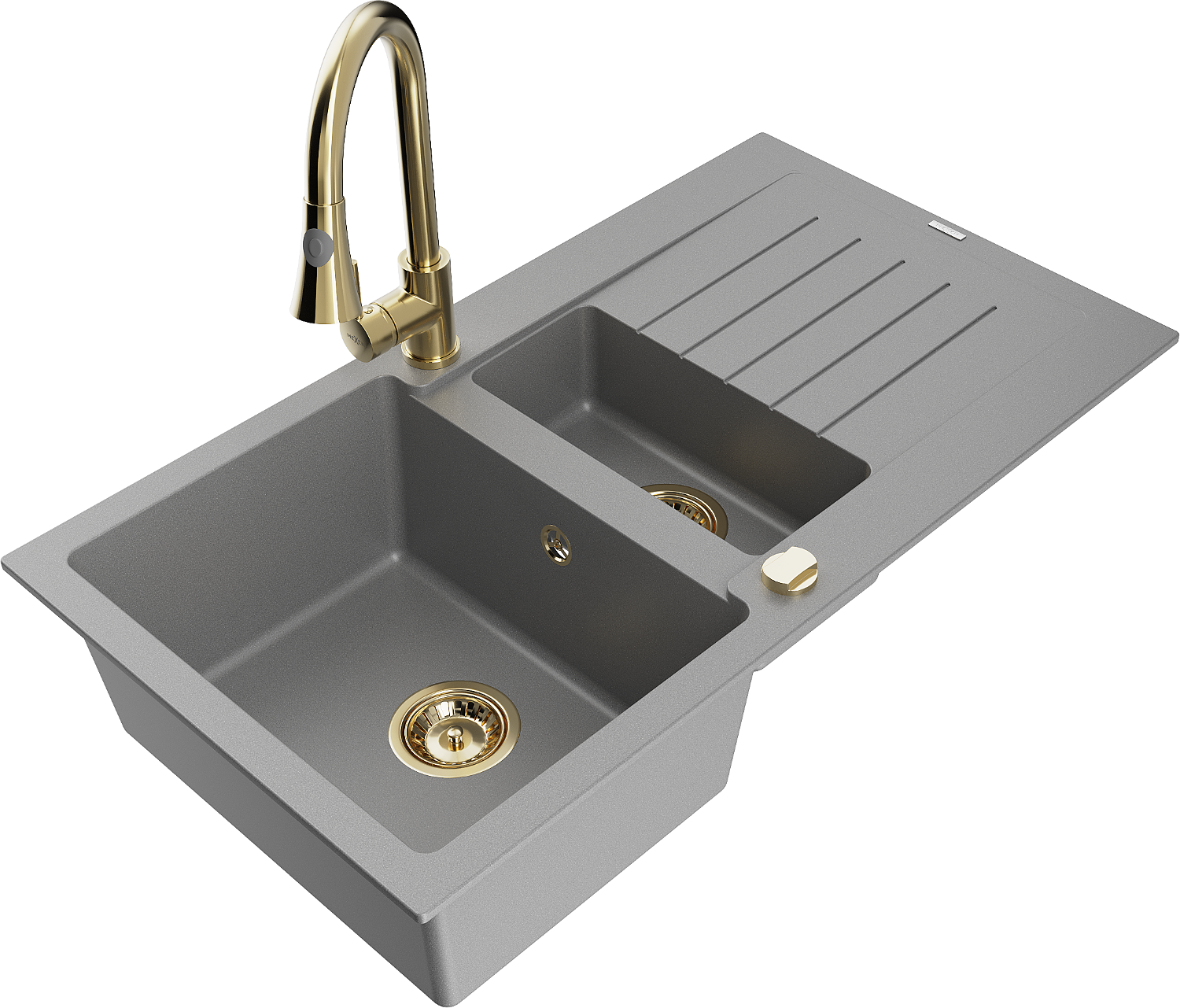 Mexen Matias granite sink 1.5-bowl with drainer and Elia kitchen tap, grey - 6502-71-670101-50