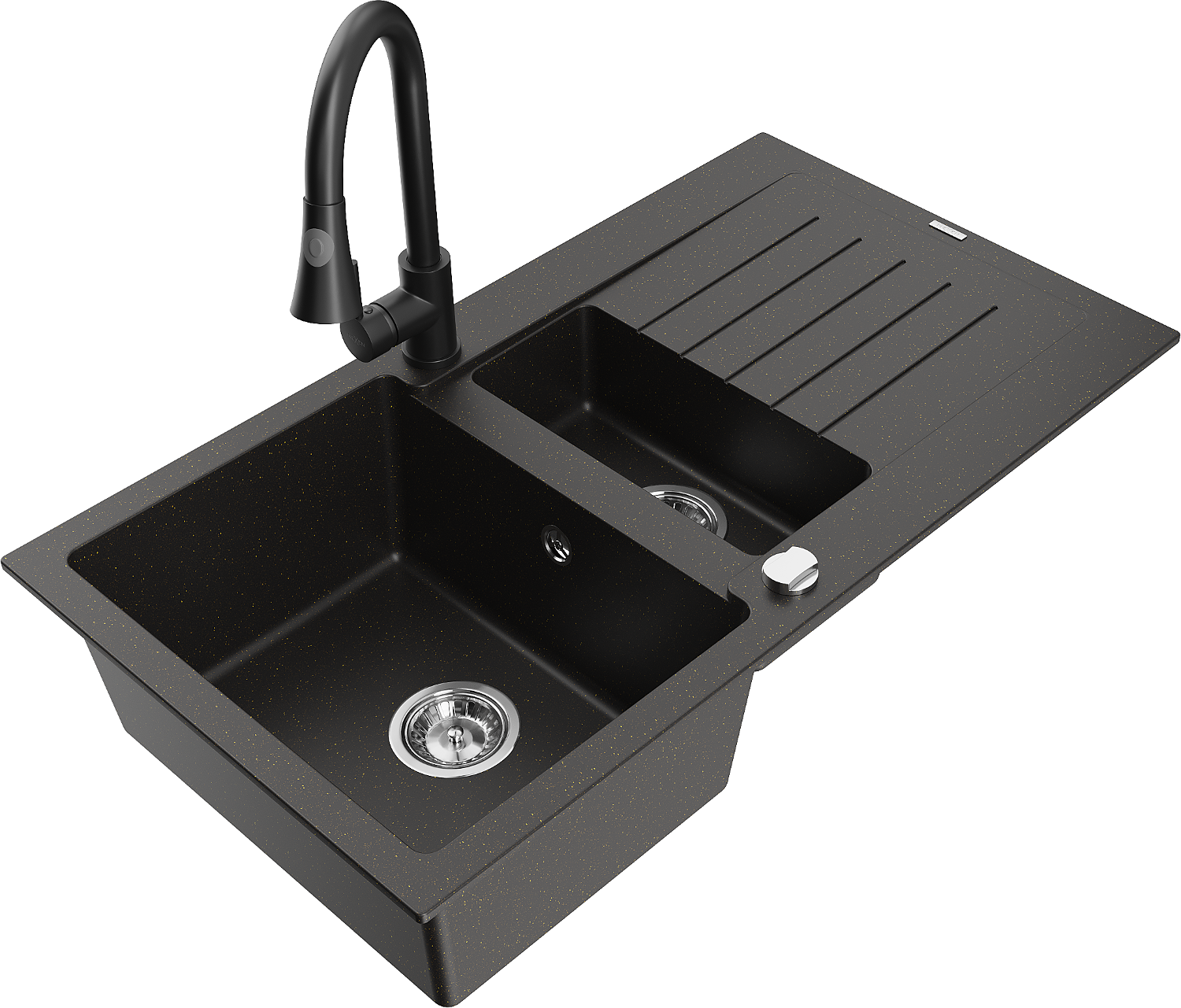 Mexen Matias granite sink 1.5-bowl with drainer and Elia kitchen tap, black/gold metallic - 6502-75-670101-70