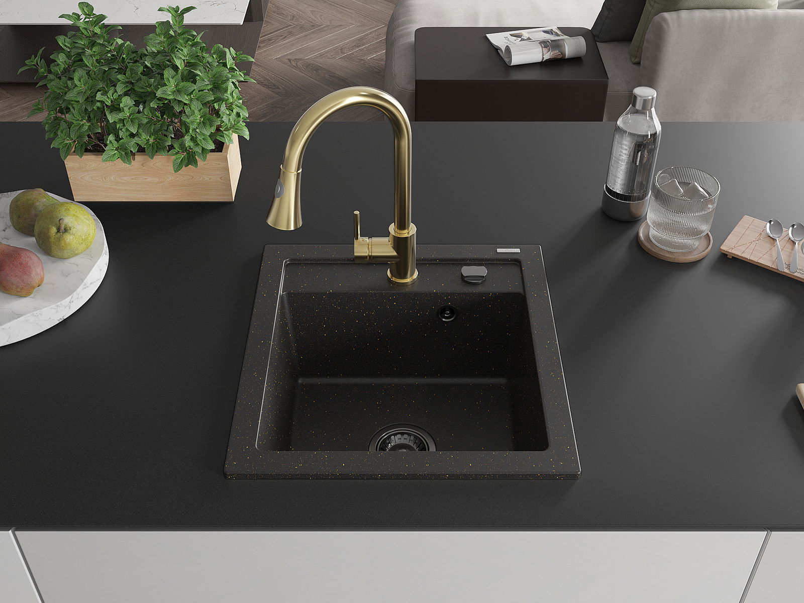 Mexen Vito granite kitchen sink 1-bowl with Elia kitchen tap, black/gold metallic - 6503-75-670101-50-B