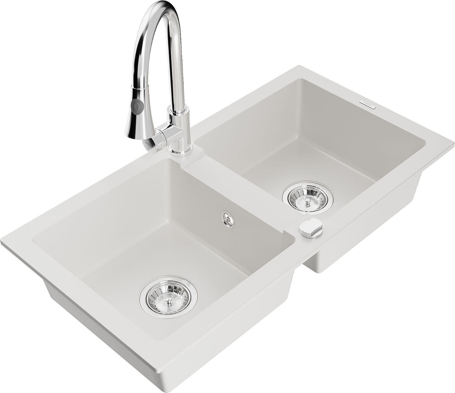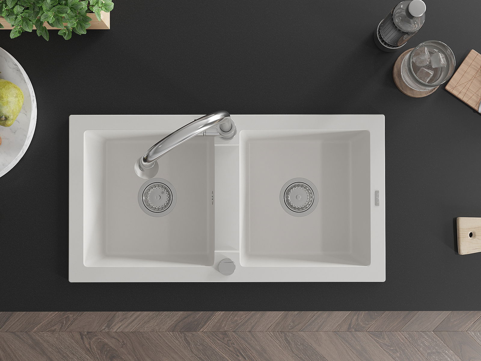 Mexen Mario 2-bowl granite sink with Elia kitchen tap, white - 6504-20-670101-00