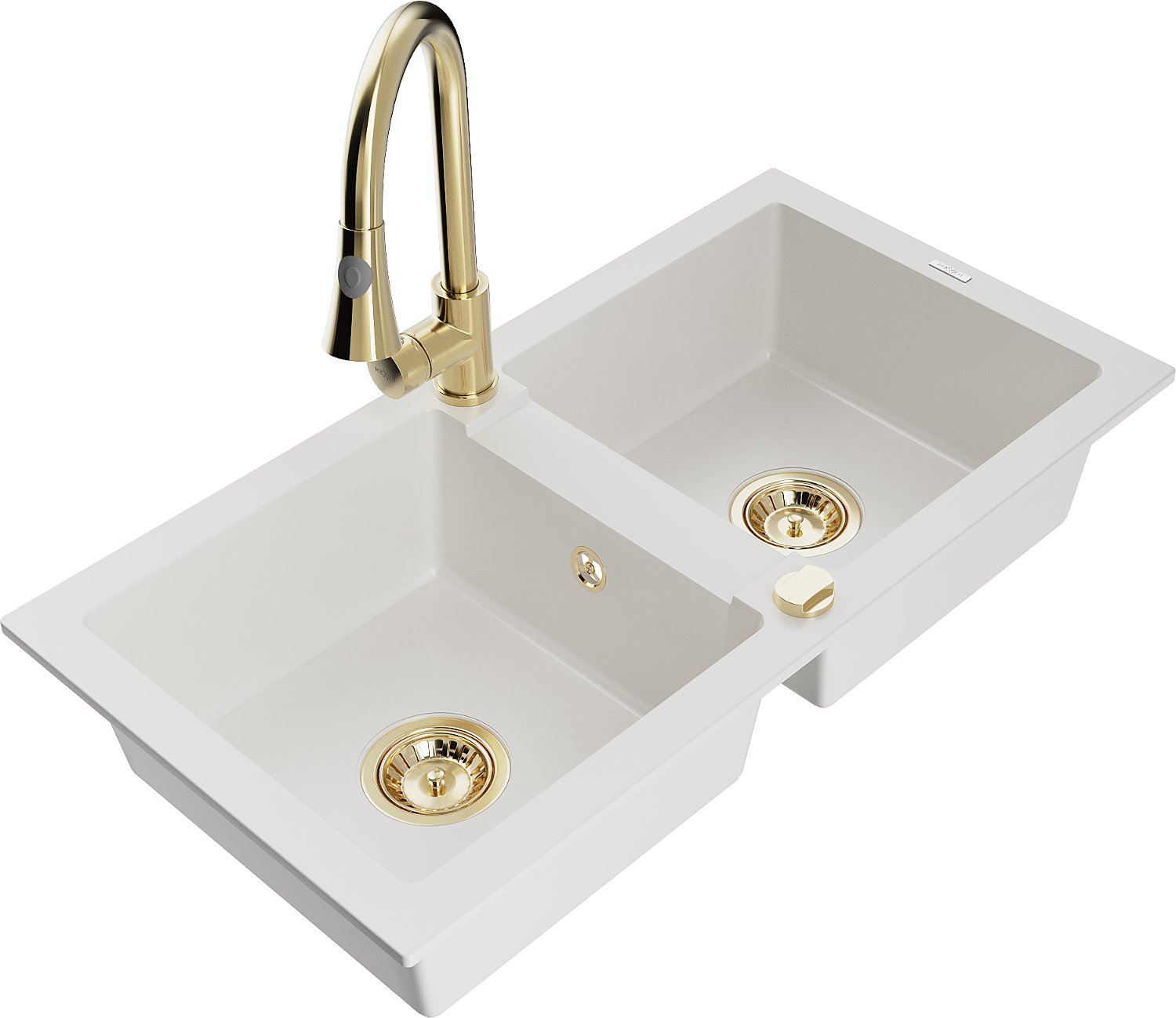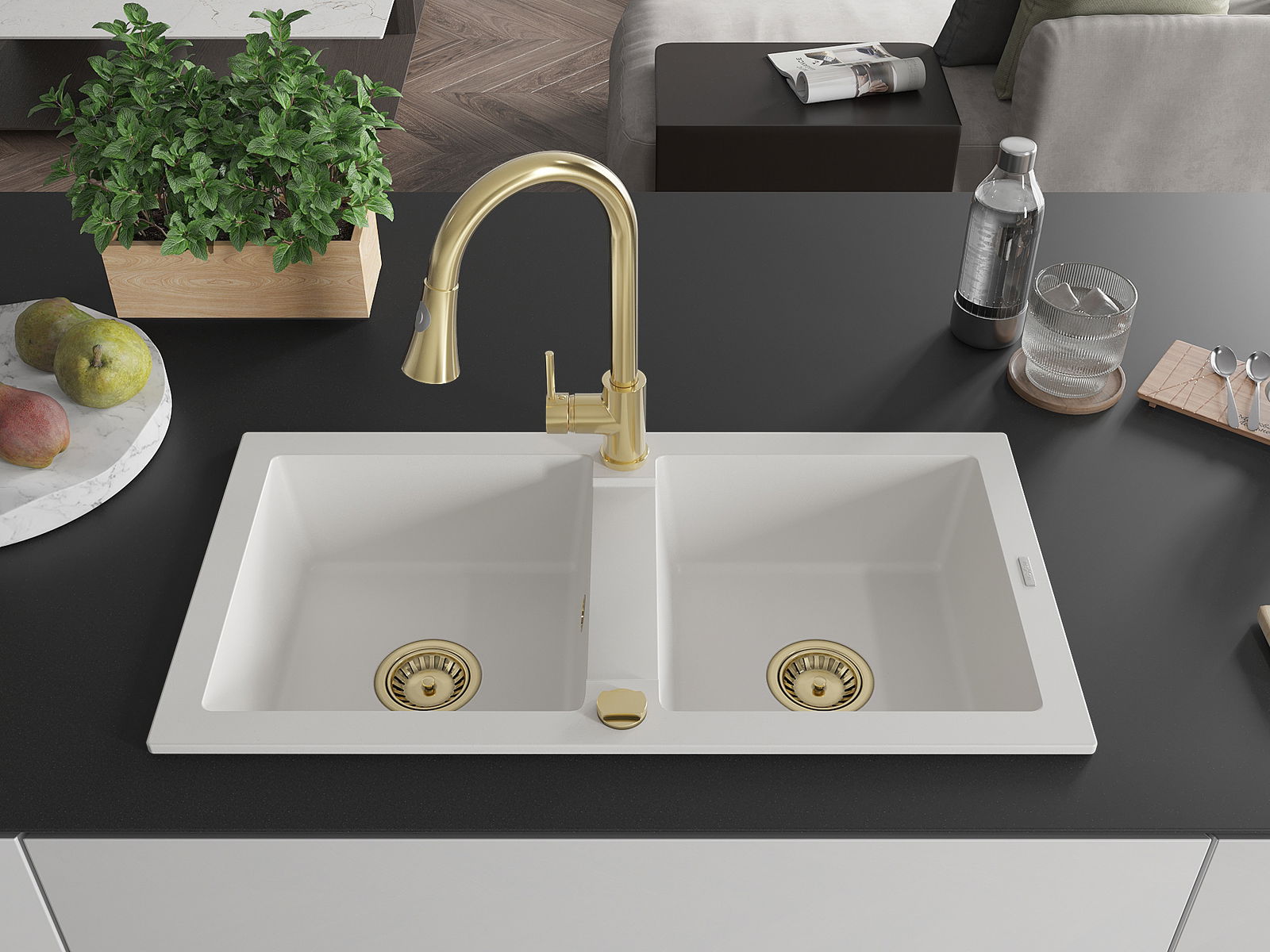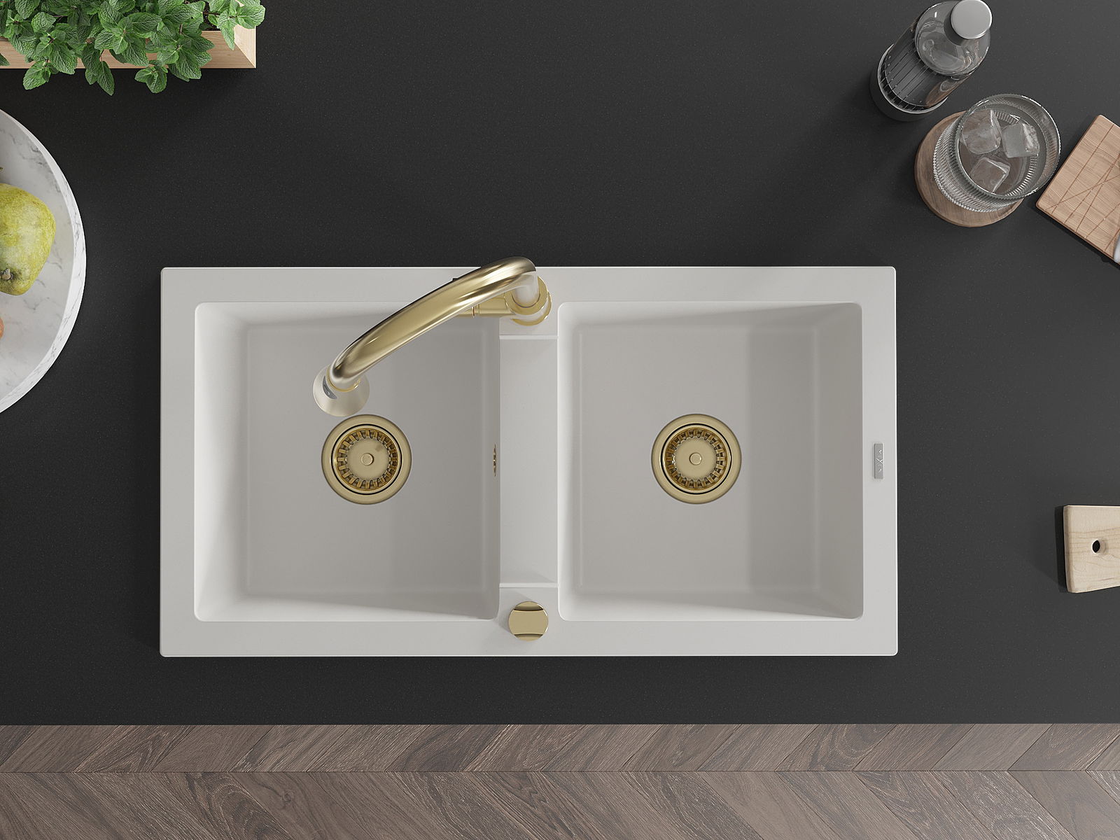 Mexen Mario 2-bowl granite sink with Elia kitchen tap, white - 6504-20-670101-50