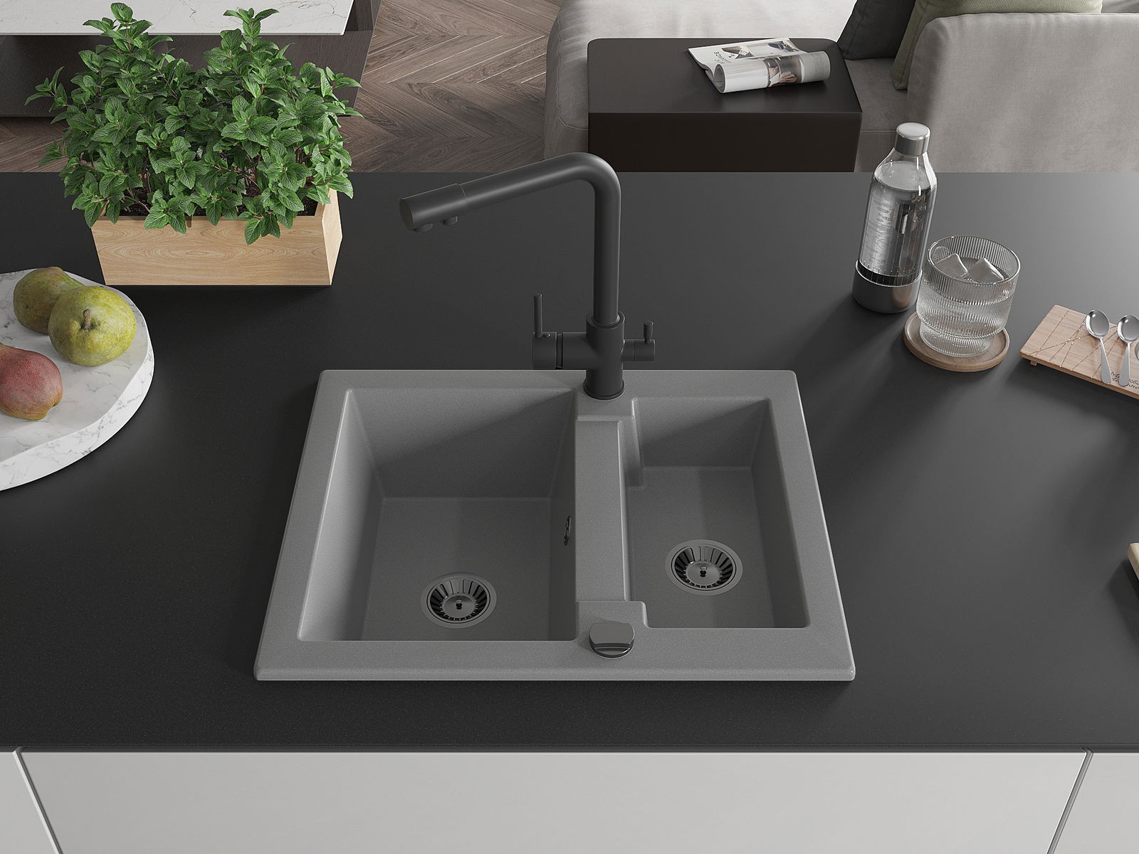 The sink is made of high quality granite. It is an elegant and, above all, practical complement to every kitchen, regardless of its style. High quality and granite durability ensure many years of use.