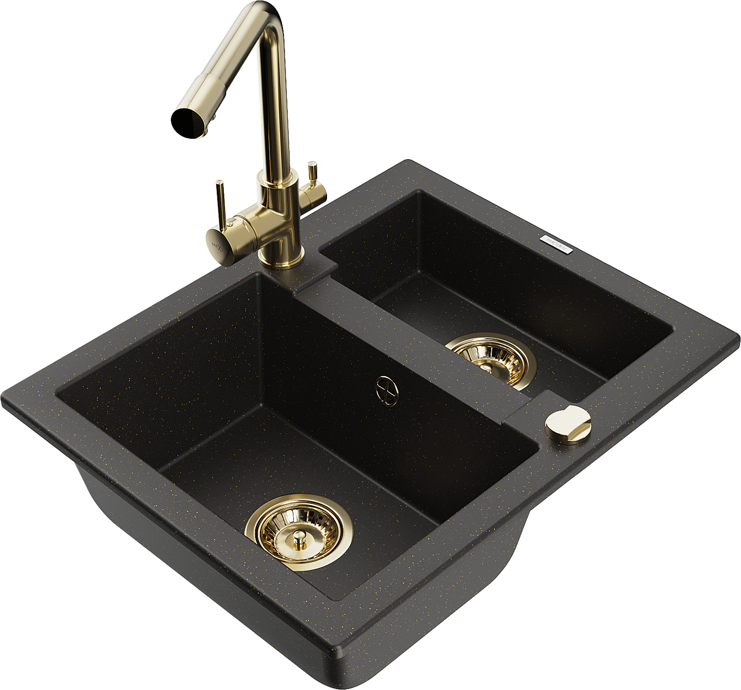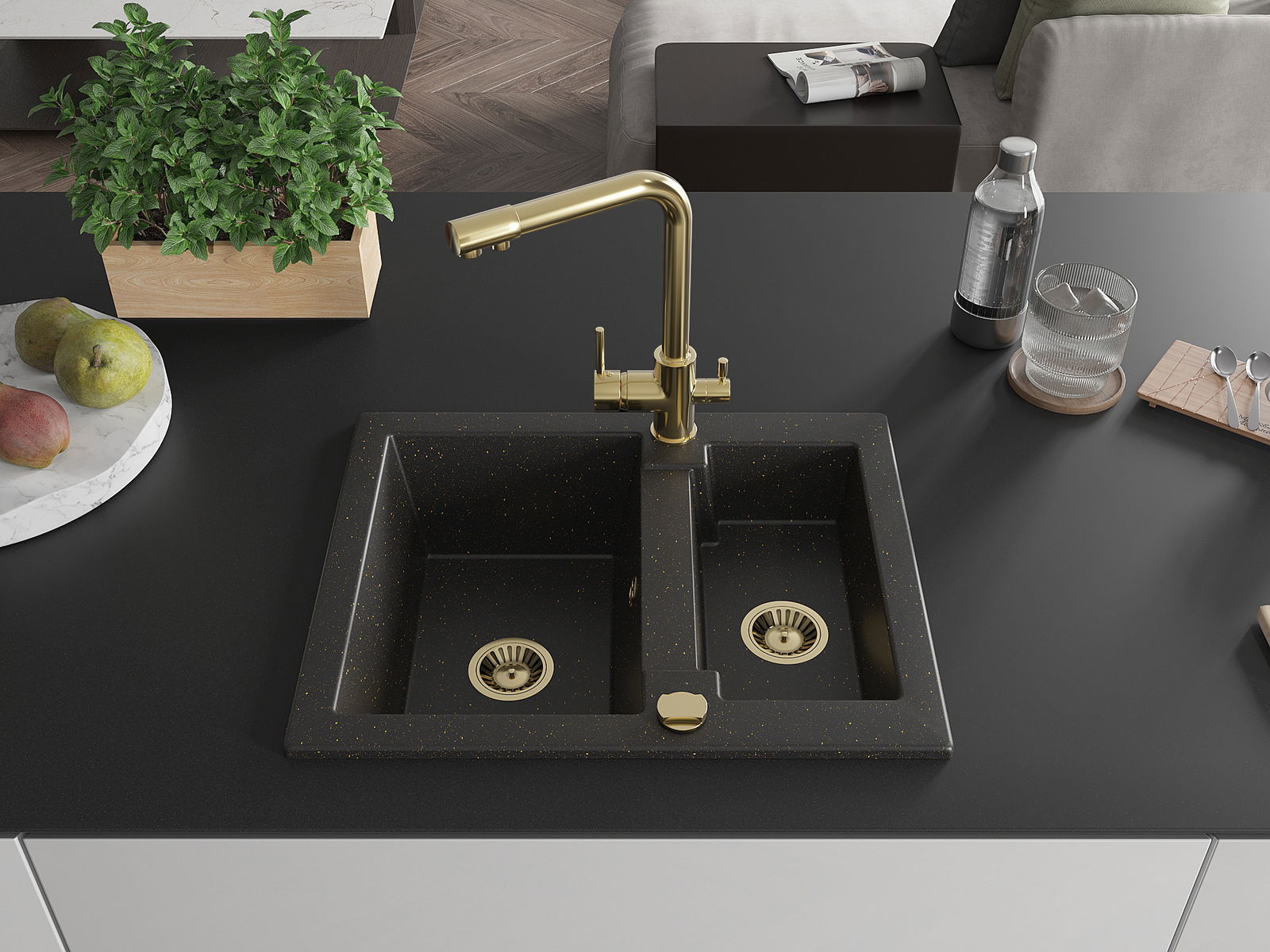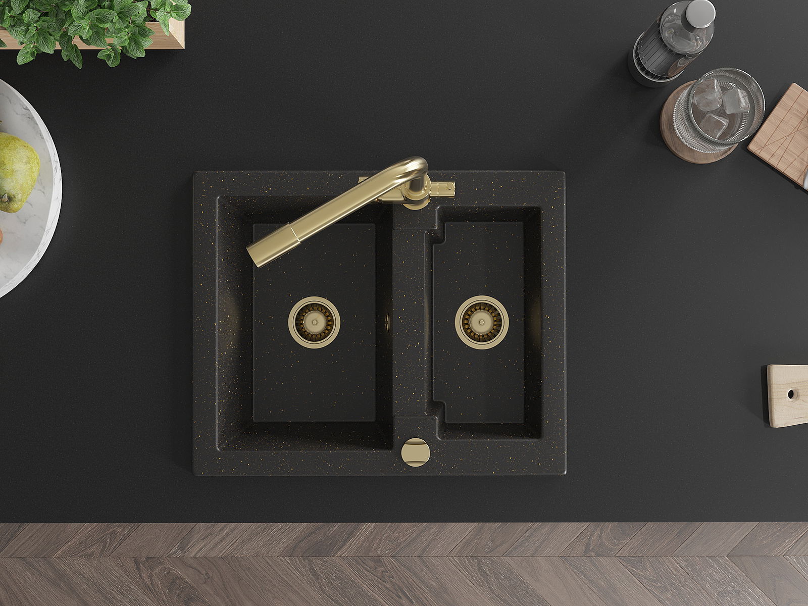 Mexen Carlos granite 1.5-bowl sink with Duero kitchen tap, black/golden metallic - 6518-75-671600-50