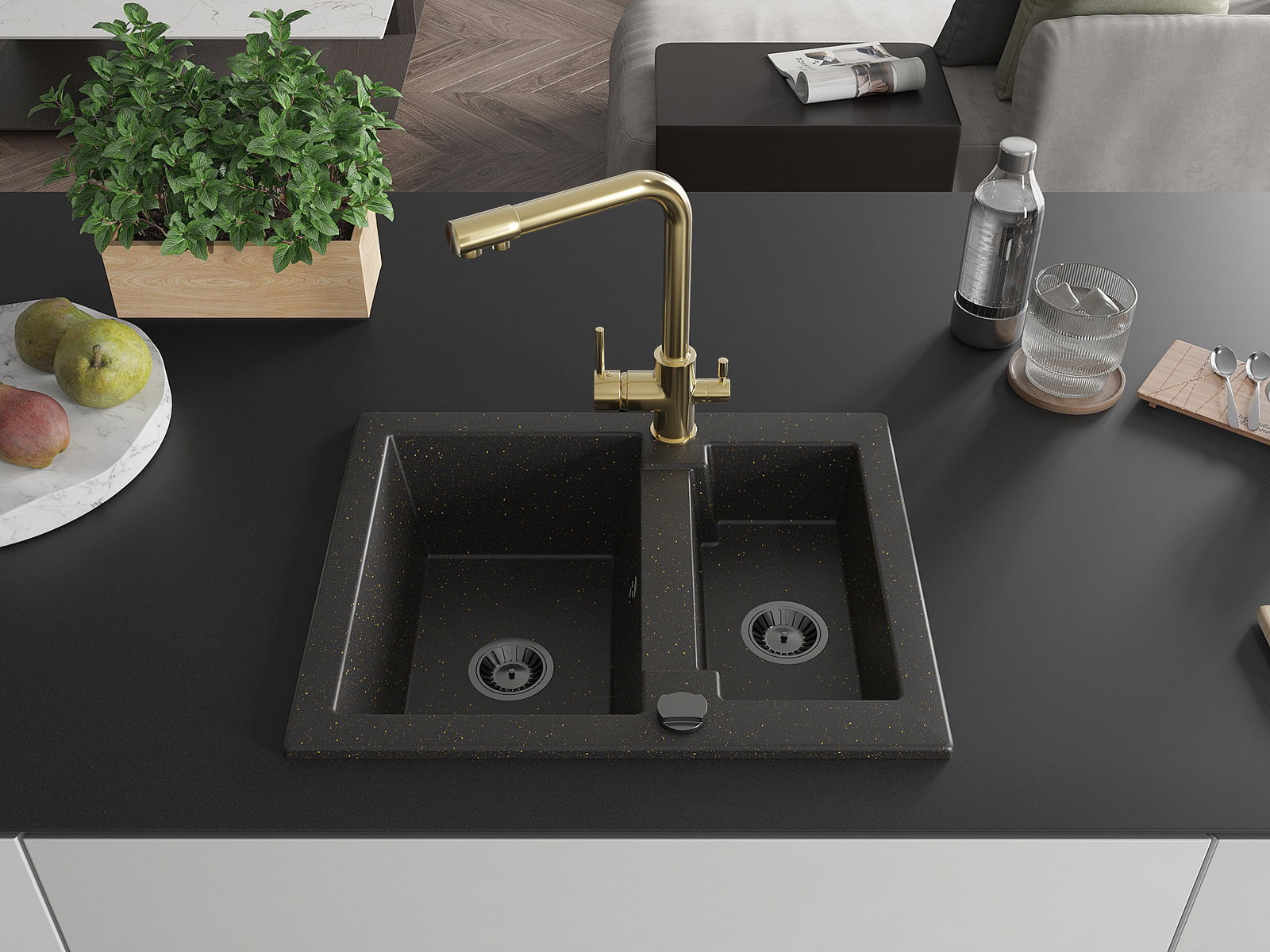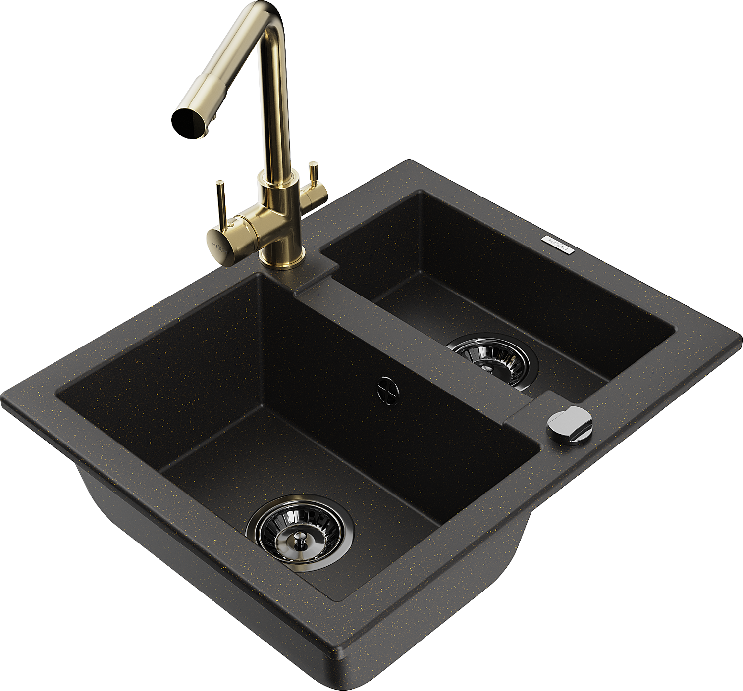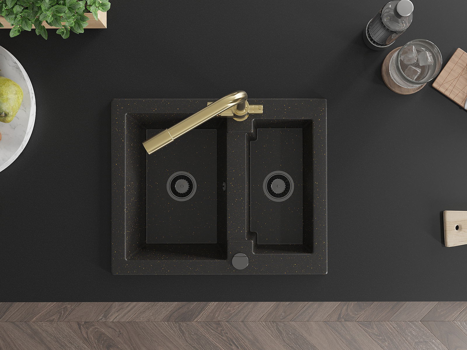 Mexen Carlos granite sink 1.5-bowl with Duero kitchen tap, black/gold metallic - 6518-75-671600-50-B