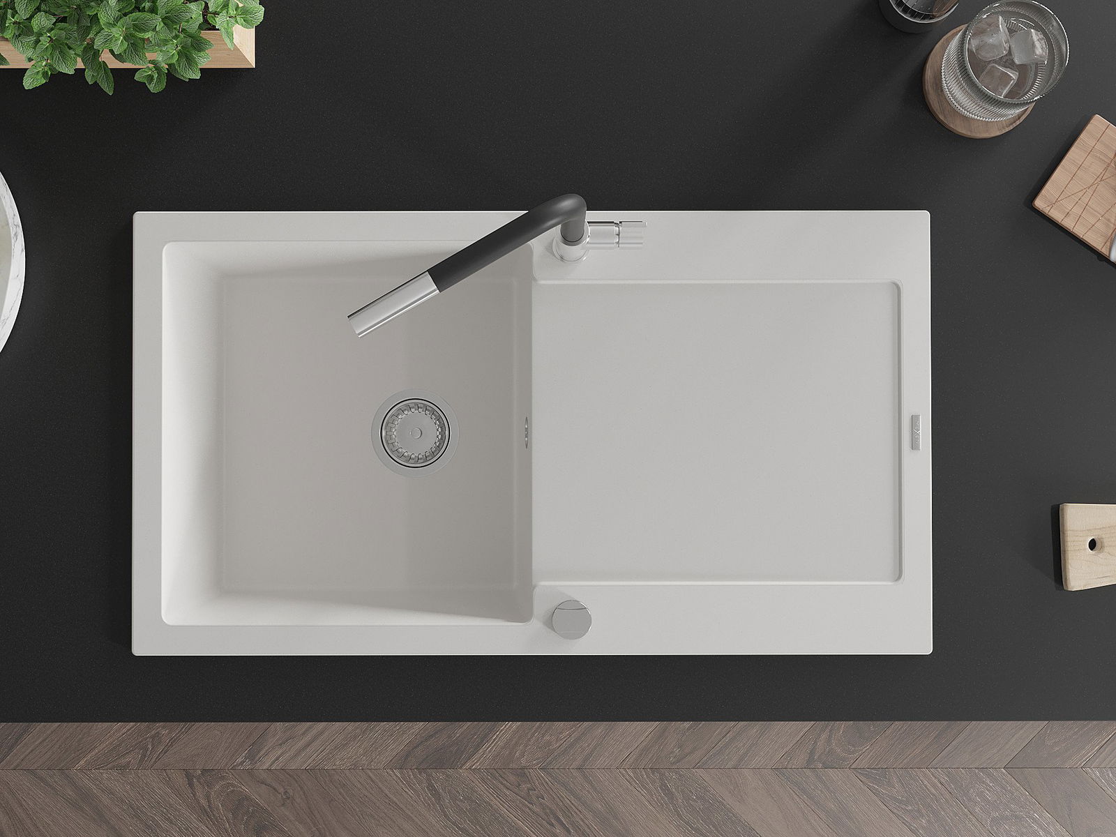 Mexen Leo 1-bowl granite sink with drainer and Flora kitchen tap, white - 6501-20-670401-07