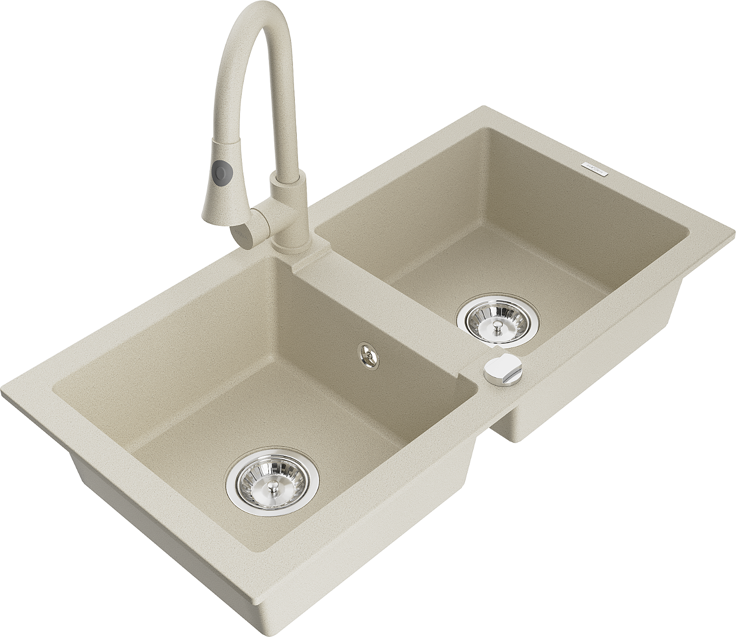 Mexen Mario granite sink 2-bowl with Elia kitchen faucet, beige - 6504-69-670101-69