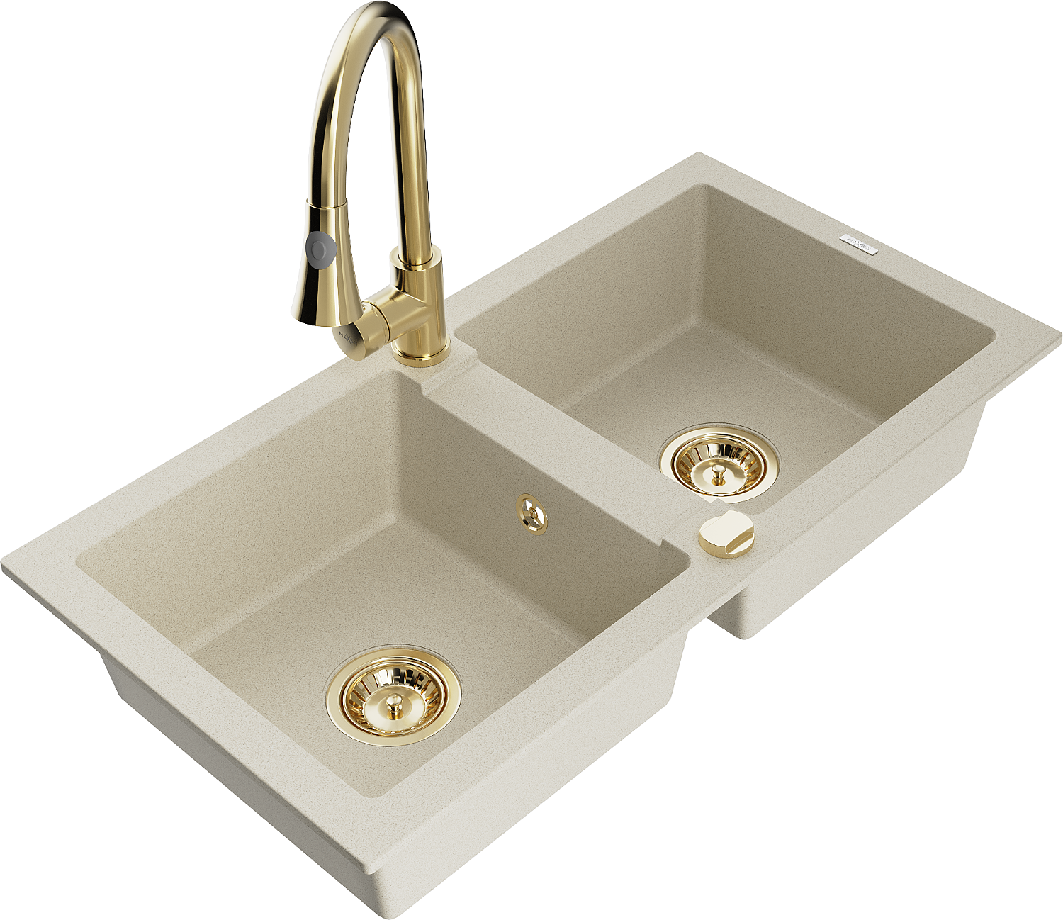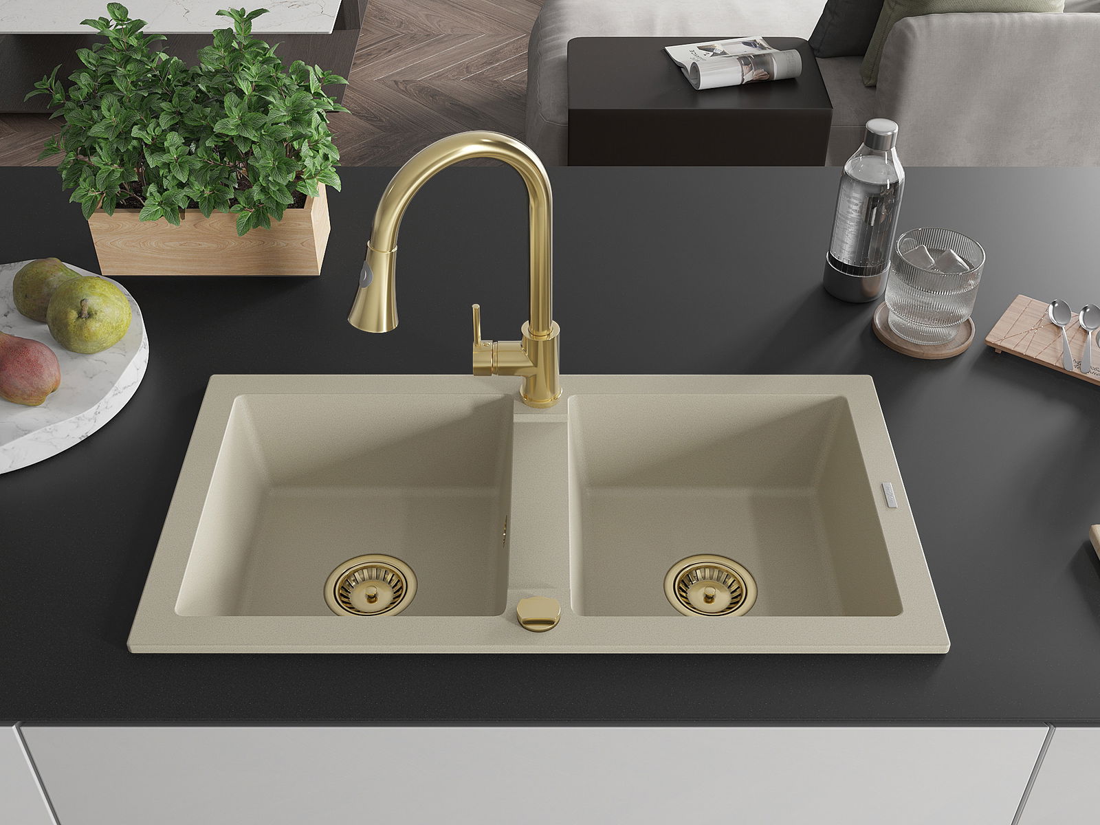 Mexen Mario 2-bowl granite kitchen sink with Elia kitchen tap, beige - 6504-69-670101-50