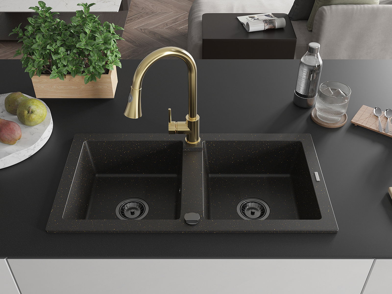 Mexen Mario granite sink 2-bowl with Elia kitchen tap, black/gold metallic - 6504-75-670101-50-B