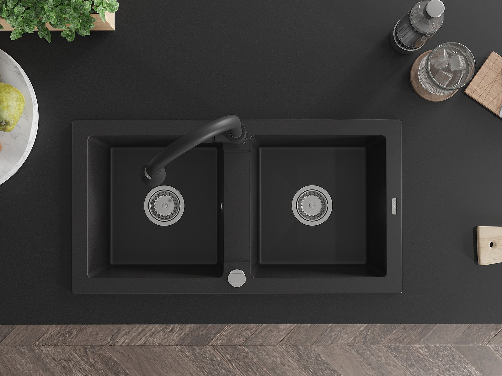 Mexen Mario 2-bowl granite sink with Elia kitchen tap, black - 6504-77-670101-70