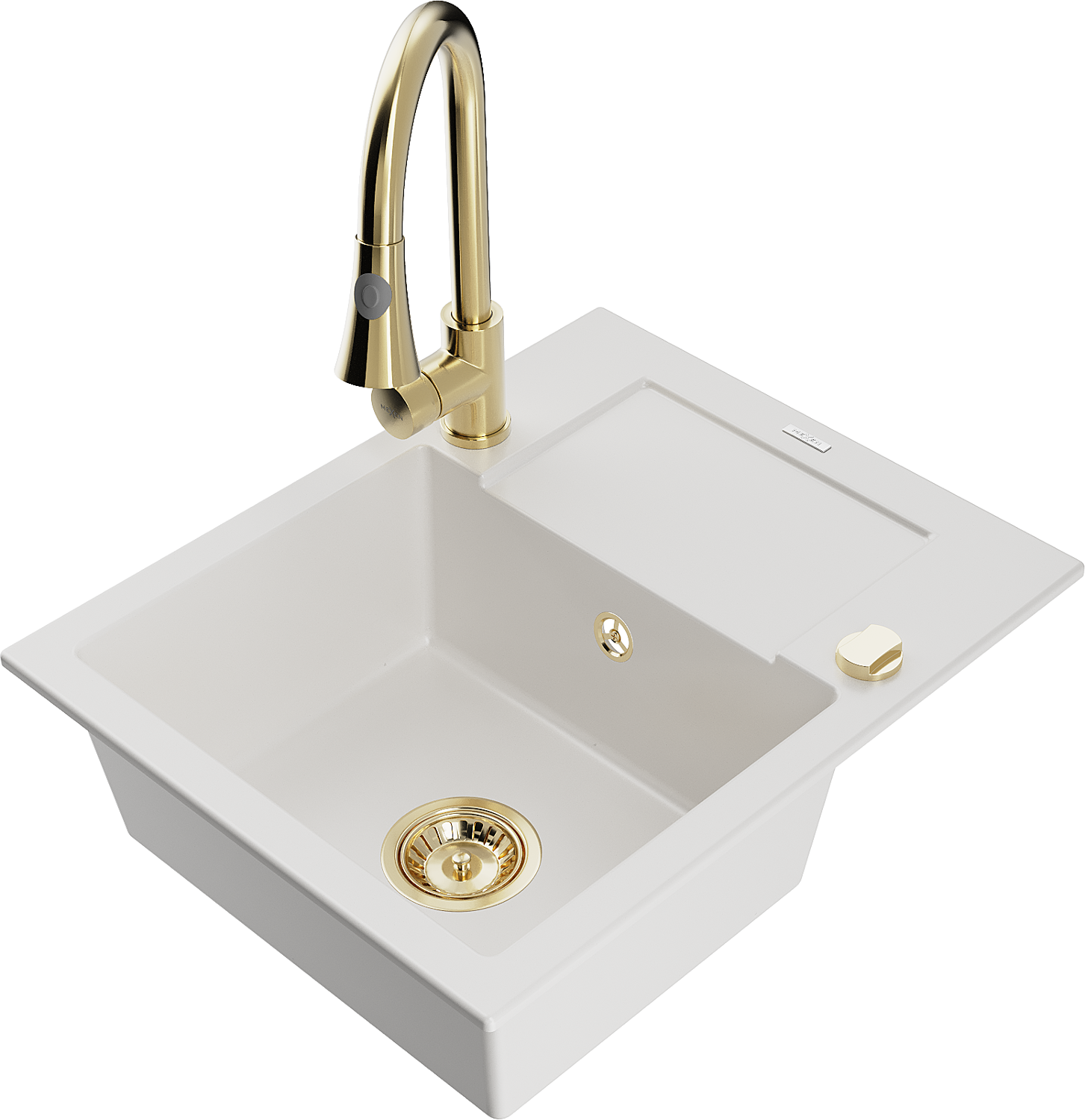 Mexen Enzo 1-bowl granite sink with drainer and Elia kitchen tap, white - 6506-20-670101-50