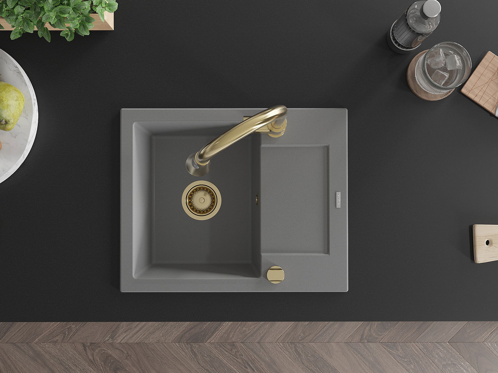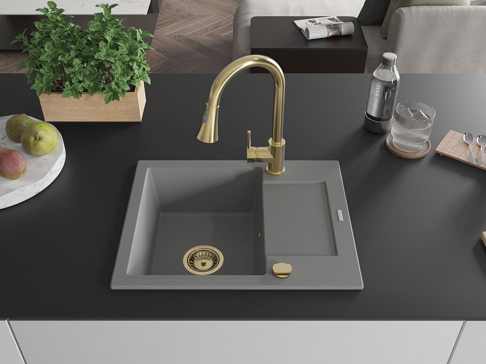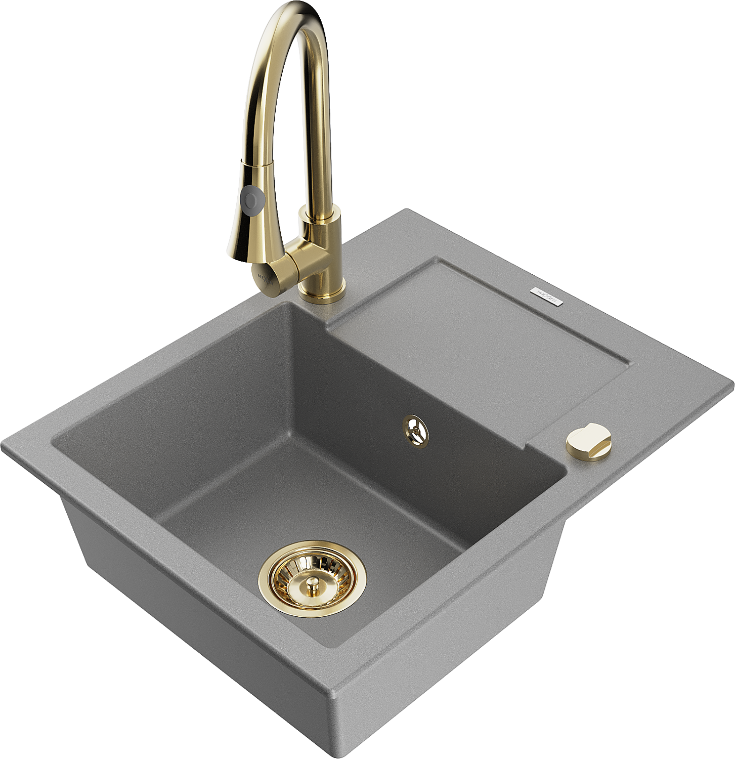 Mexen Enzo granite sink 1-bowl with drainer and Elia kitchen tap, grey - 6506-71-670101-50